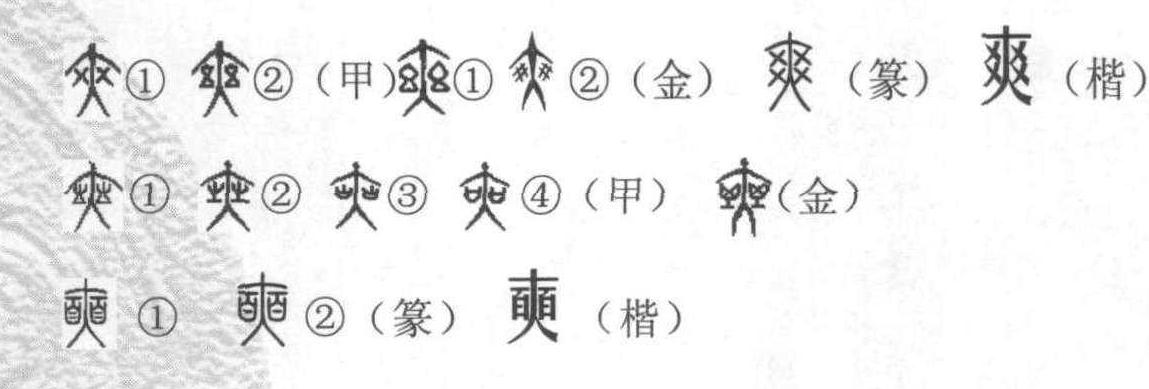 汉字是中华民族的集体记忆。 甲骨文❶的 “爽”,从大,从爻,“爻” 横断在“大”的两旁, 为带有象形韵味的会意字。“ ”像一位正面站立的人形, 腋下夹裹着卜筮的符号“爻”。“ ”的取象可以从两个方面来理解: 一是“爻”的横置,“大”(人)的左右腋下各有一“×”; 一是“×”即“爻”的简约后的符号。“爻”,八卦中组成卦象的符号称谓,它具有阴阳交错和相互变化的意蕴。古代的卜筮活动,是贵族统治者君王政治生命的一部分。商王的活动几乎一举一动,都要先行占卜。二十世纪初开始发掘的大约共有近20万片河南安阳殷墟甲骨文,几乎片片都是商王卜筮后的记载。那时候商王对于卜筮的依赖已经到了无以复加的程度。 甲骨文 ❷的 “爽” ( ), 从大, 从两幺, “大”的左右腋下各一“幺”,仍为带有象形韵味的会意字。“幺”与“爻”同音,这里的“幺”是以音代替“爻” 的,其寓意不变 。“爽”是人经过卜筮以后,依据爻象与爻辞所旨示而产生的一种怿悦的心情。从“爽”在殷墟卜辞屡有出现,即可看出它的含义。“爽”多用于商王与配偶之间的造句: “王宾大乙爽妣丙”; “王宾祖乙爽妣己”; “妣丙大乙爽”;“妣甲祖辛爽”等,这些卜辞,大概是记载商王与配偶之间的缠绵之事和两性愉悦心情的流露吧。时至今日人们仍有将这种事称作“爽”。