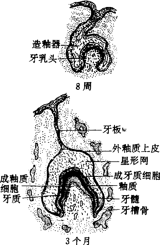 | 释义 | 牙的发生 牙的发生人胚第7周时,上、下颌表面上皮细胞增生,形成沿上、下颌形状的“U”形牙板,伸入深部间充质内(见图2.4-7)。牙板向唇的一面,以一定间隔,几乎同时形成10个圆形突起,称造釉器,这就是乳牙原基。造釉器发育增大,底部凹陷成为帽状。帽的凹窝内有间充质伸入,称牙乳头。造釉器发育为牙的釉质,牙乳头分化为牙本质和牙髓,造釉器外围的间充质分化为牙骨质和牙周膜。胚胎后期,牙板与造釉器相连的部分退化消失。牙釉质和牙本质都从牙冠顶部开始形成,然后向牙根扩展。在牙根开始生长之前整个牙冠早已形成。牙根的增长是出牙的一个重要原因,因为牙根的增长将牙冠推出牙龈,在牙冠开始露出时,牙根还没有完全长成,直到牙冠完全露出后,牙根才充分生长。乳牙在婴儿1—3岁时生长完成,7—11岁又陆续脱落。胎儿第3个月时牙板的舌面上开始形成恒牙原基,在乳牙的舌面,对应地产生10个恒牙原基,其他恒牙原基由牙板向后延伸的部分产生,但发生的时间不同。第二、第三恒磨牙的原基分别在出生后第4、第5年出现,其余仍在胎儿时期发生。恒牙的体积较小,分化发育也较晚。恒牙的形成过程与乳牙相同。恒牙发生后一直处在停止生长的状态。在牙板消失后,恒牙原基便位于乳牙舌侧的牙槽陷窝内。到儿童6岁时,颌骨体积接近成人颌骨大小,恒牙才开始生长,从而推挤相应乳牙的下方,促使乳牙脱落。当恒牙生长时,上位乳牙的根便被破骨细胞吸收掉,于是恒牙便位于乳牙剩余部的下方。最后,整个乳牙根部几乎完全毁损,松动的冠部脱落,恒牙便有了出牙的位置。