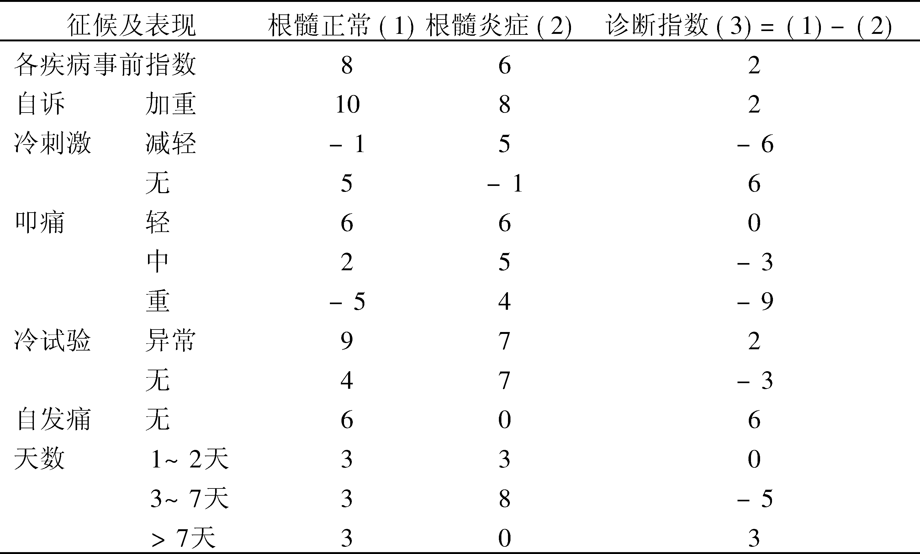 | 字词 | 牙髓病鉴别诊断指数表 |
