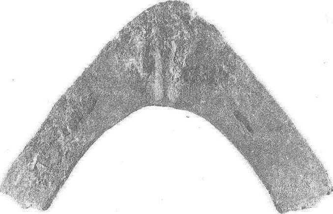 图2 江苏吴县出土石犁 的铁犁铧冠出土,犁耕已在中原地区广泛使用。但出土的多数是V字型铧冠,宽度在20厘米以上,比商代铜犁大得多(见图3)。它是套在犁铧前头使用,以便磨损后及时更换,减少损失。这说明战国的耕犁已比商周时期进步得多,从而大大提高了耕地能力。但这一时期耕犁的结构仍不清楚。