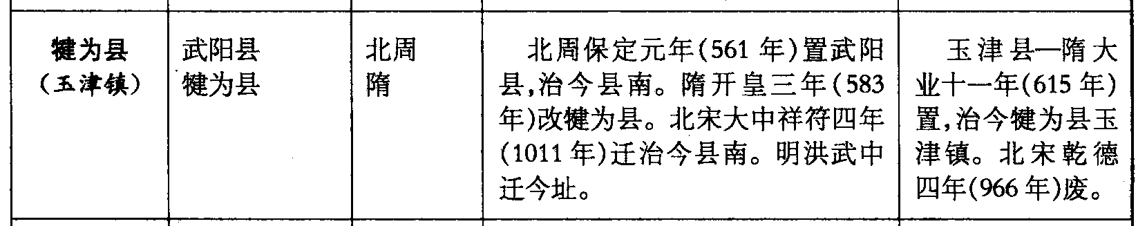 犍为县(玉津镇)武阳县犍为县北周隋北周保定元年(561年)置武阳县,治今县南。隋开皇三年(583年)改犍为县。北宋大中祥符四年(1011年)迁治今县南。明洪武中迁今址。玉津县—隋大业十一年(615年)置,治今犍为县玉津镇。北宋乾德四年(966年)废。