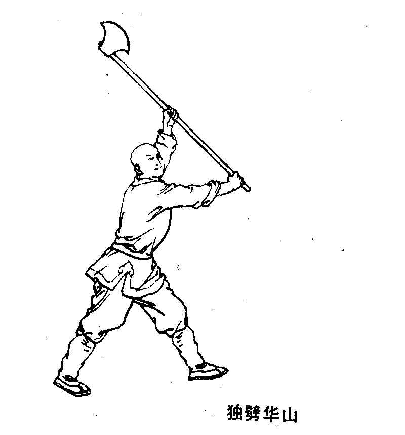 斧法。指正中下砍之法。《十八般武艺全书·板斧法》:“独劈华山,此为正中下劈之势,亦如大刀之有砍,长矛之有盖也,专攻敌人顶门。”
