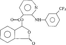 | 释义 | 他尼氟酯 C21H13F3N2O4=414.34 CAS-66898-62-2 2-[[3-(三氟甲基)苯基]氨基]-3-吡啶羧酸-1,3-二氢-3-氧代-1-异苯并呋喃基酯。 3-Pyridinecarboxylic acid,2-[[3-(trifluoromethyl)phenyl]amino]-,1,3-dihydro-3-oxo-1-isobenzofuranyl ester. 2-(α,α,α-三氟-间-甲苯胺基)烟酸2-苯并呋喃酮基酯。 2-Phthalidyl2-(α,α,α-trifluoro-m-toluidino)nicotinate. 消炎镇痛药。 Talniflumate,Somalgen,BA 7602-06. INN,USAN.