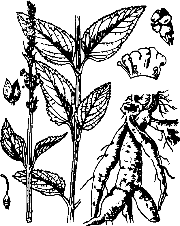 图2 北玄参 玄参药名。出 《神农本草经》。又名重台、黑参、元参。为玄参科植物浙玄参Scrophularianingpoensis Hemsl. 或北玄参 S. buergerianaMiq. 的根。前者主产浙江、四川、湖北; 后者产东北、华北地区。苦、咸,微寒。入肺、肾经。滋阴降火,凉血解毒。 ❶治热病伤津,烦渴,发斑,肠燥便秘,阴虚骨蒸劳热,夜寐不宁,自汗盗汗,吐血,衄血。 ❷咽喉肿痛,目赤,痈肿,瘰疬。煎服: 9~15g。反藜芦。浙玄参根含玄参素 (scrophularin)、甾醇、氨基酸、脂肪油、微量挥发油等。北玄参根含玄参苷(Harpagoside),甲氧基玄参苷,对甲氧基桂皮酸和芍药苷。天门冬酰胺动物试验能镇咳平喘,防止实验性胃溃疡的发生。玄参苷有抗炎、镇痛、解痉作用。 玄参ningpo figwortScrophularia ningpoensis Hem-sl.,玄参科,玄参属。高大草本。生于溪边、山坡林下、高草原中,亦有栽培。分布于中国长江流域和贵州、福建等省区。植株地下部具有数条纺锤状或胡萝卜状根,除花茎外,全体被灰白色毛和腺毛。茎四棱形。单叶,对生,叶卵形至卵状披针形,叶缘有细钝锯齿,叶基圆形或近截形,具叶柄。聚伞花序疏散排列,呈圆锥状;花暗紫色,花萼5深裂;花冠唇形,上唇长于下唇,管部近壶形;雄蕊5,4枚能育,1枚退化;子房由2心皮构成2室,胚珠多数。蒴果。要求暖湿环境,宜选排水良好的砂质土或腐殖质土。以根芽繁殖,秋季播种,翌年10~11月可挖根。根入药,有滋阴、降火、生津、解毒、消肿散结等功效。 玄参别名元参。多年生草本,高60—100厘米。根圆锥形,肥厚。茎直立四棱形。下部叶对生,上部叶互生。聚伞花序,顶生,花暗紫色。果卵圆形。种子多数。疆内均有栽培。具有滋阴降火、消炎解毒、利咽喉的功能。药用根。主治咽喉肿痛、肺炎、颈淋巴结核、血栓闭塞性脉管炎等病症。 玄参scrophularia ningpoensis又叫元参,系玄参科植物浙玄参的干燥根。内含玄参素、哈巴甙、甾醇、挥发油、脂肪酸、生物碱等。本品有滋阴降火、凉血解毒、降压、降血糖等作用。临床用于治疗热病烦渴、齿龈炎、扁桃体炎、咽喉炎、急性淋巴结炎、淋巴结结核、便秘等。应用时常与其他药伍用,用量6~12g,水煎服。忌与藜芦同用。 玄参xuán shēn《本草纲目》草部第12卷玄参(79)。药名。 【基原】为玄参科植物玄参的根。 【别名】重台(《本经》),鬼藏、正马、鹿肠、端、玄台(《吴普本草》),咸(《别录》),逐马(《药性论》),馥草(《开宝本草》),黑参(《孙天仁集效方》),野脂麻(《本草纲目》),元参(《本草通玄》)。 【性味】苦咸,凉。 ❶《本经》:“味苦,微寒。” ❷《吴普本草》:“神农、桐君、雷公、扁鹊:苦,无毒。岐伯:咸。李氏:寒。” ❸《药品化义》:“味微苦微咸略甘,性凉。” 【归经】入肺、肾经。 ❶《药类法象》:“足少阴肾经。” ❷《雷公炮制药性解》:“入心、肺、肾三经。” ❸《本草新编》“入脾、肾、胃三经。” 【功用主治】滋阴,降火,除烦,解毒。治热病烦渴,发斑,骨蒸劳热,夜寐不宁,自汗盗汗,津伤便秘,吐血衄血,咽喉肿痛,痈肿,瘰疬。 ❶《本经》:“主腹中寒热积聚,女子产乳余疾,补肾气,令人明目。” ❷《别录》:“主暴中风,伤寒身热,支满狂邪,忽忽不知人,温疟洒洒,血瘕下寒血,除胸中气,下水,止烦渴,散颈下核、痈肿、心腹痛、坚癥,定五藏。” ❸《药性论》:“能治暴结热,主热风头痛,伤寒劳复,散瘤瘿瘰疬。” ❹《日华子本草》:“治头风热毒游风,补虚劳损,心惊烦躁,劣乏骨蒸,传尸邪气,止健忘,消肿毒。” ❺《医学启源》:“治心懊𢙐烦而不得眠,心神颠倒欲绝,血滞小便不利。” ❻《品汇精要》:“消咽喉之肿,泻无根之火。” ❼《本草纲目》:“滋阴降火,解斑毒,利咽喉,通小便血滞。” ❽《本草正义》:“疗胸隔心肺热邪,清膀胱肝肾热结。疗风热之咽痛,泄肝阳之目赤,止自汗盗汗,治吐血衄血。” 【用法用量】内服:煎汤,三至五钱;或入丸,散。外用:捣敷或研末调敷。 【宜忌】脾胃有湿及脾虚便溏者忌服。 ❶《雷公炮炙论》:“使用时勿令犯铜,饵之噎人喉,丧人目。” ❷《本草经集注》:“恶黄耆、干姜、大枣、山茱萸。反黎芦。” ❸《本草经疏》:“血少目昏,停饮寒热,支满,血虚腹痛,脾虚泄泻,并不宜服。” ❹《医林纂要》:“虚寒则忌。” 【成分】含生物碱、糖类、甾醇、氨基酸(为L-天门冬素L-Asparagine等)、脂肪酸(为油酸Oleic acid、亚油酸Linoleic acid、硬脂酸Stearic acid等)、微量挥发油、胡萝卜素等。 【药理】 ❶降压:玄参流浸膏对麻醉兔静脉注射,小量能使血压先略有上升,继则下降;大量则直接使血压下降。玄参的降压可能与其扩张血管功能有关。 ❷强心:蟾蜍心脏灌流玄参流浸膏小量可呈现强心作用,剂量加大则呈中毒现象。玄参还能增加小鼠心肌血流量,并增强其耐缺氧能力。 ❸降血糖:流浸膏对正常家兔皮下注射5 g/kg可使血糖略有降低。 ❹解热:从其根中提出的对甲氧基桂皮酸(p-Methoxycinnamic acid)对伤寒疫苗发热的家兔有解热作用。 ❺抗菌:玄参有抗绿脓杆菌及抗真菌作用。 ❻其他:玄参能缓解氯化钾和肾上腺素所致主动脉痉挛。拮抗环磷酰胺所致白细胞减少;能“中和”白喉外毒素,同属植物Scrophularia grossheimi中所含的总黄酮苷元有降压、降低毛细血管通透,利胆作用。Scrophularia nodosa有镇静、抗惊厥作用。 玄参 玄参地方传统中药材。又称元参。产于龙山等地。系多年生草本植物,