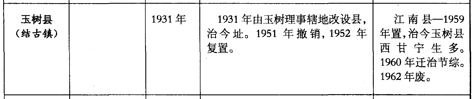 玉树县(结古镇)1931年1931年由玉树理事辖地改设县,治今址。1951年撤销,1952年复置。江南县—1959年置,治今玉树县西甘宁生多。1960年迁治节综。1962年废。