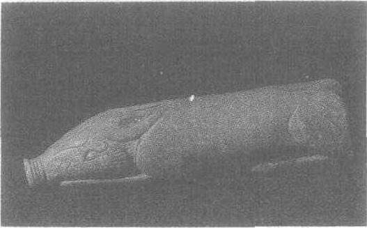 | 释义 | 玉猪 玉猪东晋早期。长11厘米,宽2.5厘米。江苏省南京市中央门外郭家山墓葬出土。江苏省南京市博物馆藏。玉料为青色。猪系圆雕而成,作卧伏状,肢体均前伸,头伏于前肢之上。猪形体细长,头尖,以阴线刻嘴、目和鬃毛,两耳抿于脑后,两端(嘴和臀部)齐平。颌及尾椎各有圆穿可佩系。汉以后的墓葬中多发现玉猪作为随葬品,时代不同其形制略异。此玉猪为东晋时期的代表作。
