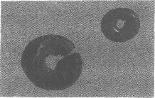 玉玦(西周晚期山西侯马北赵晋侯墓地92号墓出土) 玉玦 玉玦新石器时代河姆渡文化。小件直径2.2厘米。1973—1974年浙江省余姚县河姆渡第四文化层出土。浙江省博物馆藏。直径较大的一块玉质为绿色,缺口较大。直径小的一件玉质为紫红色,缺口尚未完全断离,可能是件半成品。此两件玉块均光滑细腻无纹饰。新石器时代,西周晚期和春秋、战国墓葬中常有玉玦发现,多放置于死者耳边,做耳饰玉器。《广韵》:“玦,如环,缺而不连”。除玉制玦外,还有石制和金属制的。河姆渡文化见“猪纹陶钵”条目。
