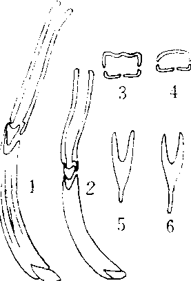 玉米象和米象的外生殖器特征比较 1、3.玉米象雄成虫阳茎及其横切面 2、4,米象雄成虫阳茎及其横切面 5. 玉米象Y形骨片 6. 米象Y形骨片 |