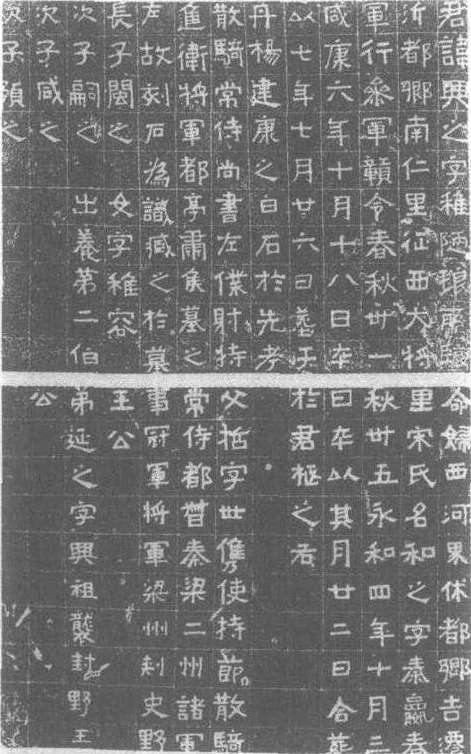 东晋。咸康七年(公元341年)及永和四年(公元348年)刻。石高37.3厘米,宽28.5厘米,厚1.1厘米。1965年江苏省南京燕子矶人台山出土。江苏省南京市文物保管委员会藏。王兴之,据考为王彬之子,王羲之的同族兄弟。王彬《晋书》有传,其次兄王旷,即王羲之的父亲。该墓志一石两面刻,一面为王兴之志,葬于咸康七年;另一面为王兴之妻宋合之志,永和四年合葬。墓志正面13行,115字,背面11行,88字。此碑书写时代正是书体由隶向楷演变时期,既有方正严整的楷书体,又有圆润顺畅的隶书笔意,有质重朴拙之气。