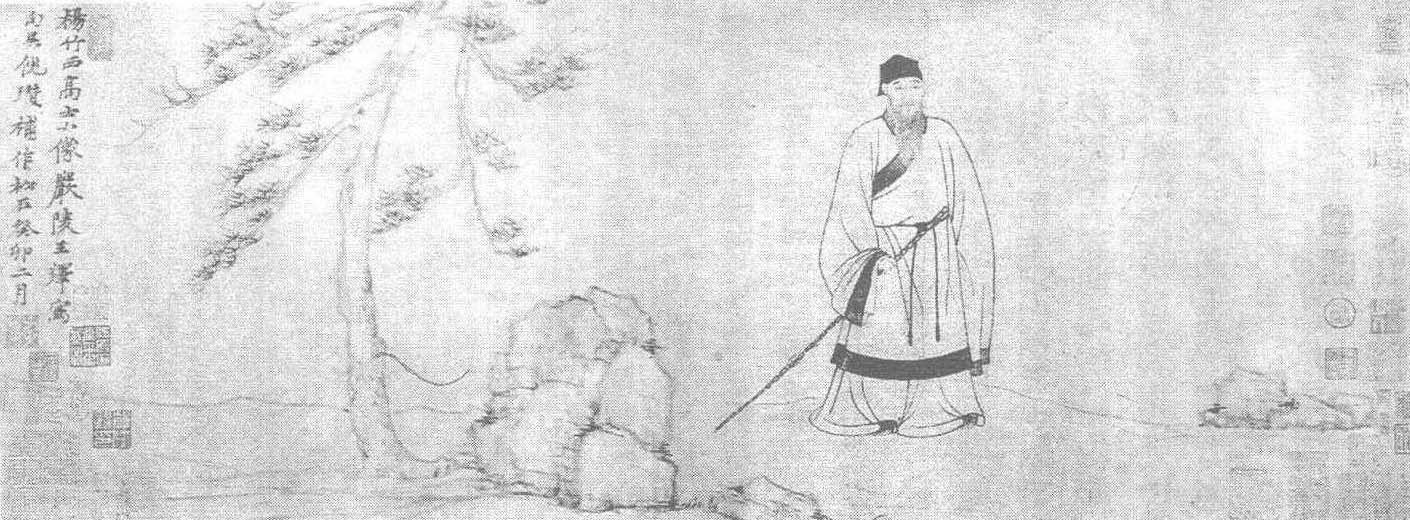 | 释义 | 王绎倪瓒杨竹西小像卷 王绎倪瓒杨竹西小像卷元。王绎、倪瓒绘。纸本墨笔。纵27.7厘米,横86.8厘米。北京故宫博物院藏。王绎(约公元1333—?年),字思善,号痴绝生,睦州(今浙江建德)人,后徙居杭州,笃志好学,雅有才思,少年时代即喜爱绘画,十二、三岁。“已能丹青,亦解写真,”后随吴中(今苏州)画家顾逵学艺,画技益进,以肖像画著名于时,“非惟貌人之形似,抑且得人之神气。”他还著有《写像秘诀》传世,是现存较早的中国肖像画理论著作。王绎主张画人物肖像必须严格按照客观对象的原貌去表现,作深入细致的观察,尤其应把握人物并不随时随地表露于外的精神气质,他反对要人正襟危坐式的写生方法,因为这样一来,被描绘的对象已呆似泥人,神气俱失了。他在总结自己创作经验时说:“彼方叫啸谈话之间,本真性情发现,我则静而求之,默识于心。闭目如在目前,放笔如在笔底。”早在东晋时,顾恺之就提出了“以形写神”的理论,指出“手挥五弦易,目送归鸿难”,苏轼、陈造等人也在画理方面对肖像画如何写神提出过与王绎类似的看法,但多数肖像画家却由于主观意愿及客观技法的限制,所作肖像仍然只是“肖而不妙”难以传神。王绎除肯定前人的见解之外,更专心于肖像画的创作,以扩大影响。同时还对表现技巧加以阐述。“彩绘法”一节则历举了人物面部的着色方法,及各种颜色的调配法,是我国色彩学方面的重要资料。王绎的作品流传很少,此图是一件能代表其绘画风格的优秀作品。小像所绘是南宋遗民杨谦。杨谦,号竹西居士,松江人。图中,他头戴软帽,身着长袍野服,杖策独立。面色详和,慈眉善目,额头、眼角堆着皱纹,颧骨突起,两颊内收,面形略见削瘦,花白的胡须垂撒胸前。小像以白描手法绘出,比例准确,衣纹用线圆劲有力,很有质感,人物面部以细笔勾描,略用淡墨烘染,生动传神,较好地表现了杨谦清廉谨慎的性格。倪瓒并为此图补景,以疏简的笔法,浅淡的墨色描绘出平缓的坡地,堆磊的岩石,孤落的青松。特定的环境更烘托了杨谦在宋亡之后,隐居乡野,不肯趋炎附世的高尚情操。卷末倪瓒题云:“扬竹西高士小像,严陵王绎写,句吴倪瓒补作松石。癸卯二月。”癸卯为至正二十三年,公元1363年。卷后有元人郑元祐、杨维贞等11家题记。此图曾由明人项元汴,清人宋荦收藏。《珊瑚网》、《大观录》著录。