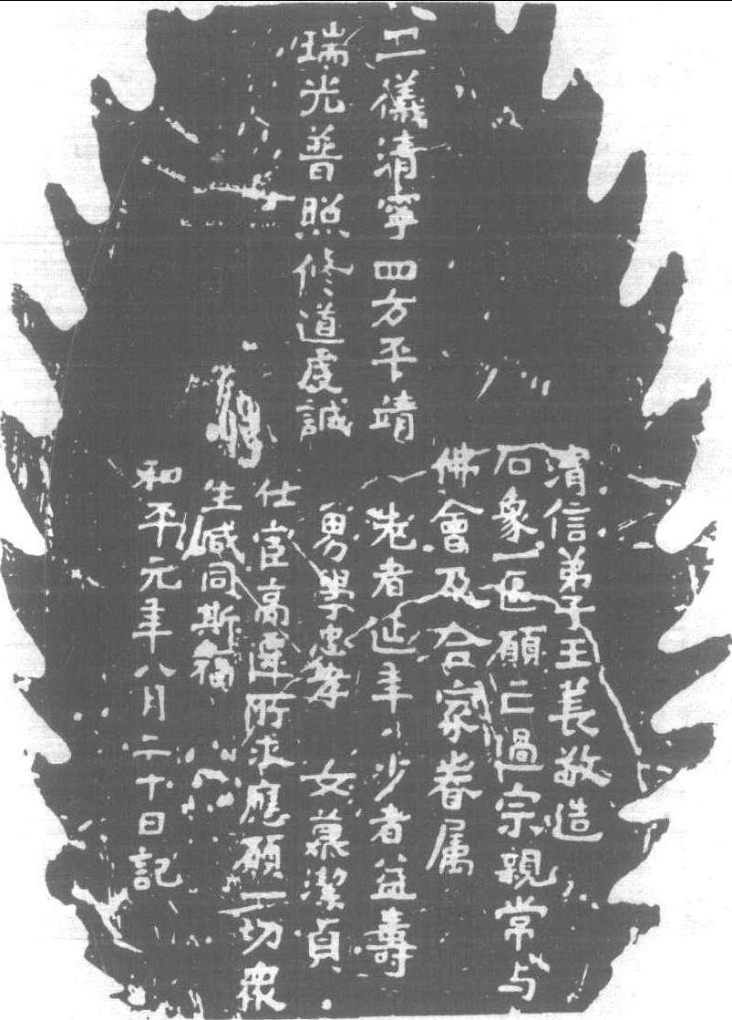 北魏·和平元年 (460) 刻。刻於銅佛背面,銅佛威風凛凛。中央刻示原文十六字: “二儀清寧,四方平靖,瑞光普照,修道虔誠。”其下有銘文八行,體勢正楷,隸意濃鬱。書法傑出,大顯北方氣風,精刻無比。是書作為龍門石窟之先導,意義甚深。