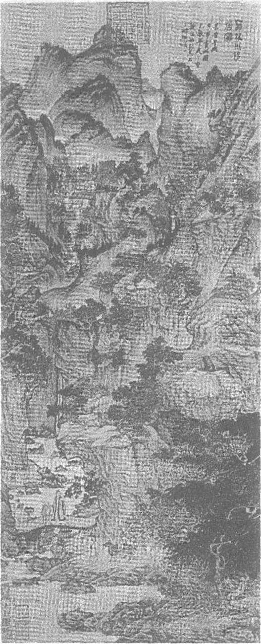 | 释义 | 王蒙葛稚川移居图轴 王蒙葛稚川移居图轴元。王蒙(见《王蒙青卞隐居图轴》条目)绘。纸本设色。纵139厘米,横58厘米。北京故宫博物院藏。此图描绘东晋人葛洪携带妻女子侄移居罗浮山的情景。葛洪,字稚川,丹阳句容(江苏)人,是东晋著名的道士,著《抱朴子》,有很高的科学价值。葛洪少习炼丹术,因听说交趾盛产丹砂,便带全家南下广州,转入罗浮山(广东增城、博罗、河源一带)隐居。山中至今尚存葛洪炼丹遗迹,道教称之为“第七洞天”。图中罗浮山峰峦层叠连贯,岗岭起伏绵延。危崖高峻,壑谷幽深。山势浑劲厚重而又不乏清幽秀逸之色。山间草木茂盛,飞瀑长流。溪泉汇聚成潭,迂曲回转,舒缓平和。水中山石浮现,石旁波纹如线。一架木桥横搭两岸。葛洪头戴道冠,身著道袍,左手牵鹿,右手执扇,站立桥头回顾张望。前后山路之上,葛氏亲眷子侄、担夫僮仆或乘牛,或步行,或背琴,或负筐。走在前面的两个人则卸担休息,等着后面的人赶上来。路径转过山崖,没入幽谷,但不久又在画面上方逶迤而出,通向一处山间小村,柴门启处,童子数人迎候于道。画面构图繁复,但不壅塞,笔法细密,山石以干笔勾描,再以淡墨渲染,略施小斧劈皴,不作苔点。树木以细笔勾形,重彩填色。红、青、黑、赭,冷暖相间,明丽而又雅致。图右上方自题:“葛稚川移居图。蒙昔年与日章画此图,已数矣。今重观之,始题其上。王叔明识。”此图曾经明人项元汴,清人安岐收藏,《珊湖网》、《墨缘汇观》、《虚斋名画续录》著录。
