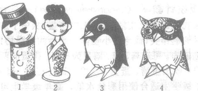 在课堂教学中,教学生用某种造型方法将球形废旧物品,组装成玩偶人形,做成各式各样的小摆设。玩偶的头形,选用多种球形物品,如乒乓球、蛋壳、中药丸小圆盒等,利用乒乓球或鸡蛋壳当头部,可直接粘接纸筒作成人身,用中药丸小圆盒作头部,可在上下盒盖中夹进纸卷当脖子,再加粘纸筒作成的人身。玩偶制作教学是充分发挥学生想象能力,充分利用现成材料,创作性组合的制作项目,课前让同学多准备些可用于制作玩偶的辅助材料,如彩纸、金银纸、花布头、毛线、钮扣以及颜料等。在制作过程中要教会学生用夸张手法加工玩偶的头发、眉眼、嘴巴不要求画得过分细致,玩偶的身体、帽子要色彩鲜艳观赏性强。在利用球形材料制作人物玩偶的同时也可启发学生根据蛋壳的外形设计制作成鸟类、鼠类小动物,在蛋壳下粘三角形折纸片,作成双脚,以防蛋壳滚动或摆放不稳。