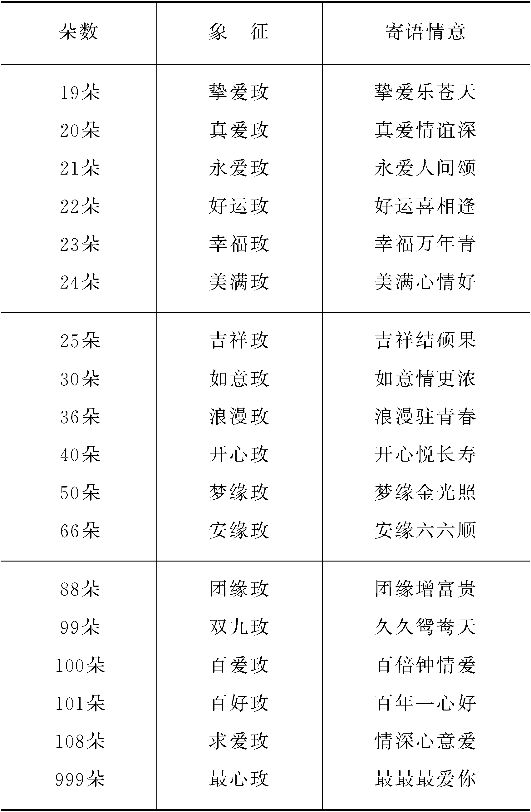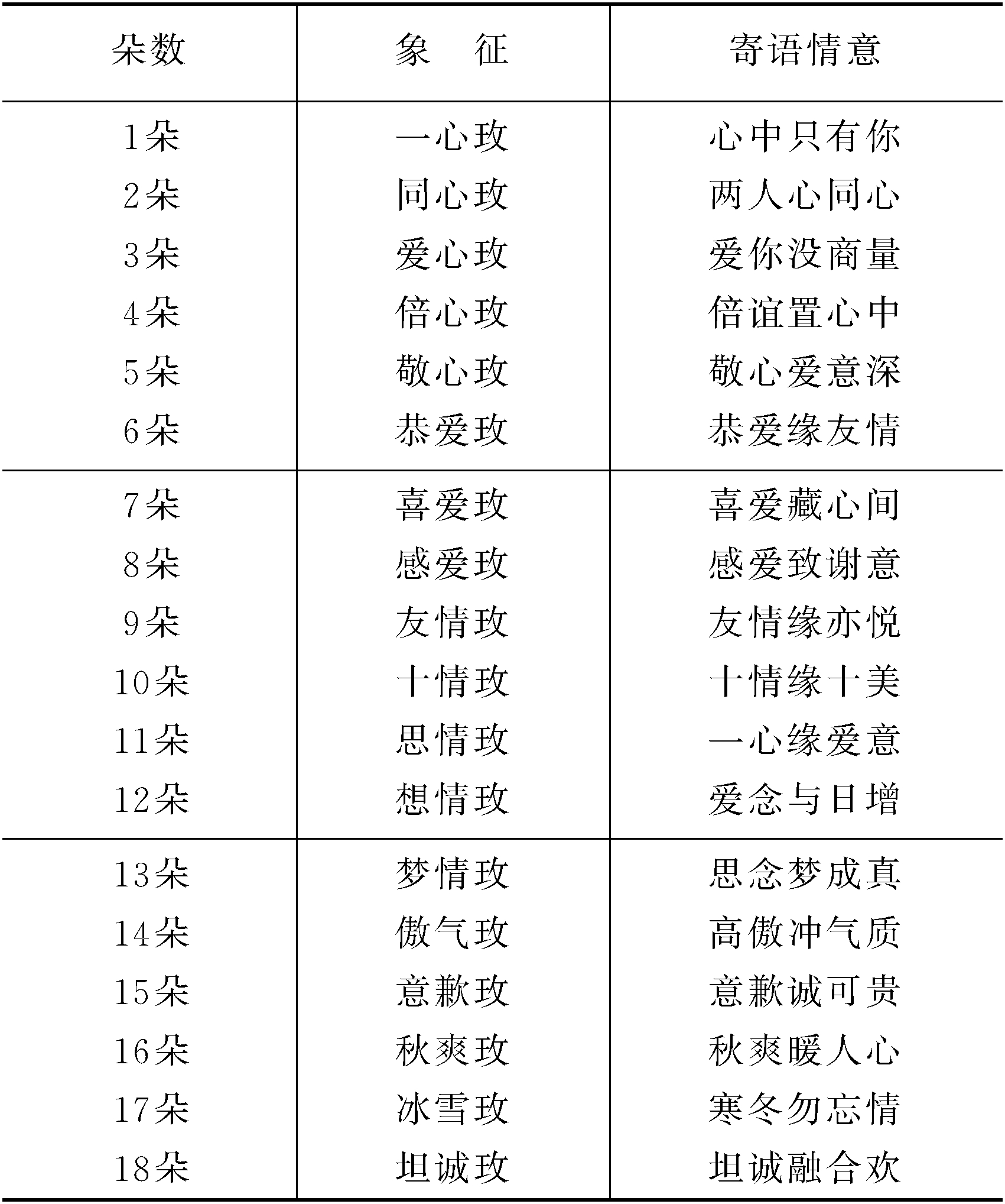 玫瑰是幸福之花,象征友谊与爱情。粉红是初恋,深红是热恋,白色是纯洁、尊敬,黄色是歉意、失恋,橙色是美丽、可爱,淡绿是青春。不同的数量还可以蕴含不同的爱意(见下表)。