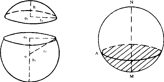 球面被一个平面截得的一部分。这个平面截球面所得的圆叫做球冠的底, 垂直于截面的球的直径被截面截得的线段叫做球冠的高。例如,图1就是球面被一平面截成的两个球冠。⊙O1和⊙O2分别是它们的底,h1和h2分别是它们的高。球冠也可以看做一圆弧绕着它所在的半圆的直径旋转一周而得到的。如图2,当半圆MAN以直径MN为轴旋转一周时, 这半圆上的一条弧MA随着旋转得到一个球冠。