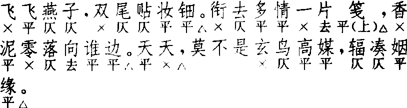 △。《玉镜记·宴会》第二支首二句改作七字一句“男儿立志期高远”,似是换头,他处未见。《玉簪记·幽情》末二句改作上三下四式七字一句“尽今宵泪渍啼痕”,亦仅见。《香囊记·邮亭》、《双珠记 ·纩衣寄诗》各二支,均全叶仄韵。末句可叶仄韵,第二字平仄均可。〔琥珀猫儿坠〕连用二支或只用一支均可,总用在本套末尾,尾声之前。简称〔琥珀坠〕或〔猫儿坠〕。以〔猫儿坠〕为主的集曲有〔猫儿逐黄莺〕、〔猫儿坠梧枝〕、〔猫儿戏画眉〕、〔猫儿节节高〕、〔双猫出队〕、〔猫儿坠桐叶〕,见《南词简谱》。此外尚有他种集法,不备录。