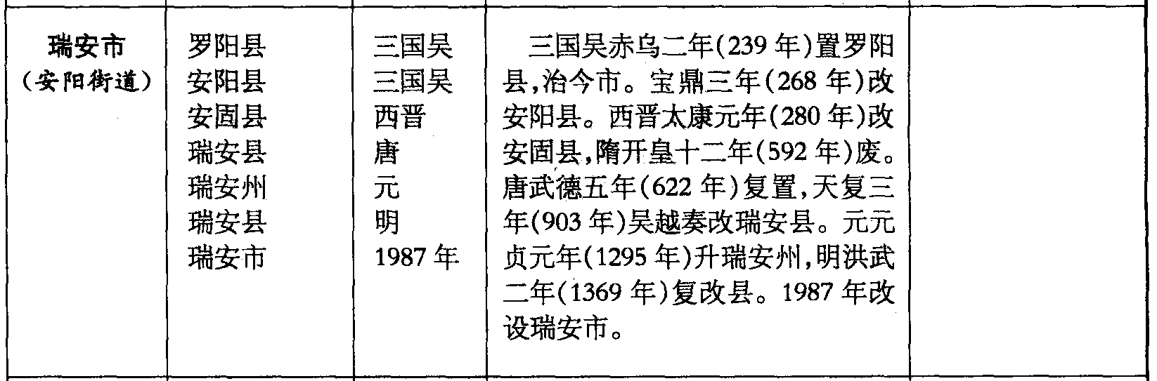 瑞安市(安阳街道)罗阳县安阳县安固县瑞安县瑞安州瑞安县瑞安市三国吴三国吴西晋唐元明1987年三国吴赤乌二年(239年)置罗阳县,治今市。宝鼎三年(268年)改安阳县。西晋太康元年(280年)改安固县,隋开皇十二年(592年)废。唐武德五年(622年)复置,天复三年(903年)吴越奏改瑞安县。元元贞元年(1295年)升瑞安州,明洪武二年(1369年)复改县。1987年改设瑞安市。