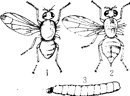 瓜小实蝇 1.雄成虫 2. 雌成虫 3.幼虫 |