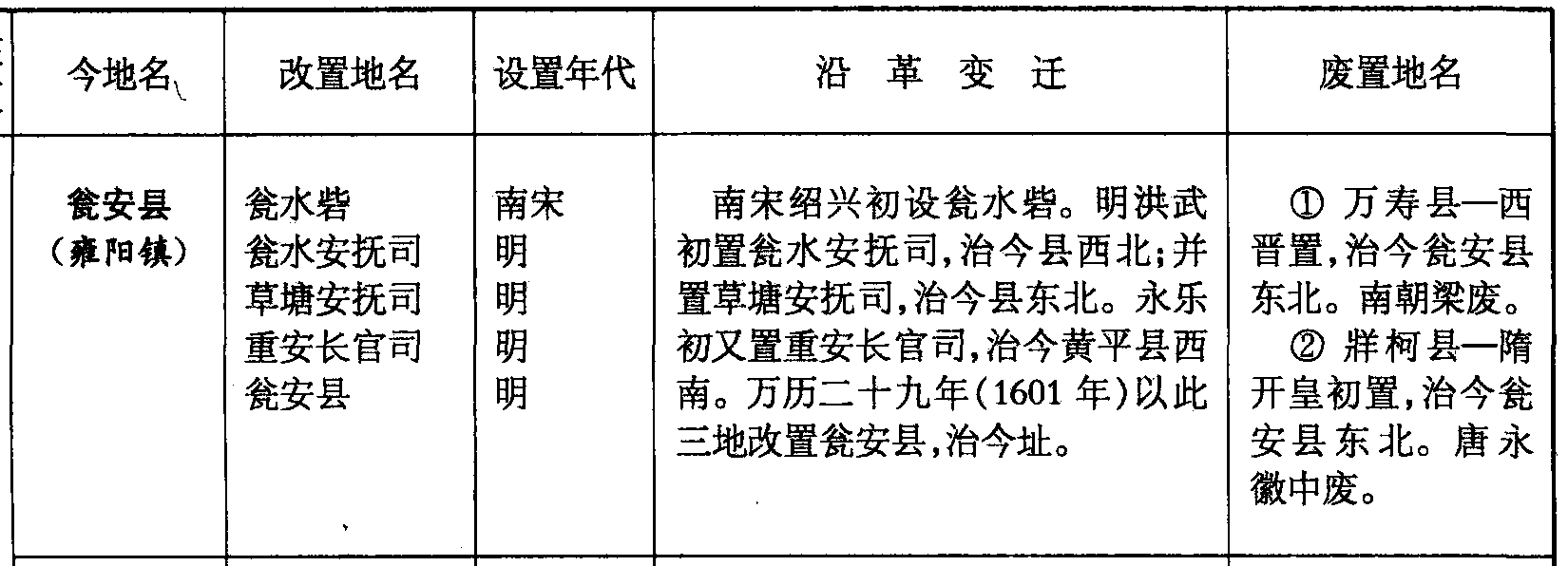 瓮安县(雍阳镇)瓮水砦瓮水安抚司草塘安抚司重安长官司瓮安县南宋明明明明南宋绍兴初设瓮水砦。明洪武初置瓮水安抚司,治今县西北;并置草塘安抚司,治今县东北。永乐初又置重安长官司,治今黄平县西南。万历二十九年(1601年)以此三地改置瓮安县,治今址。❶ 万寿县—西晋置,治今瓮安县东北。南朝梁废。❷ 牂柯县—隋开皇初置,治今瓮安县东北。唐永徽中废。