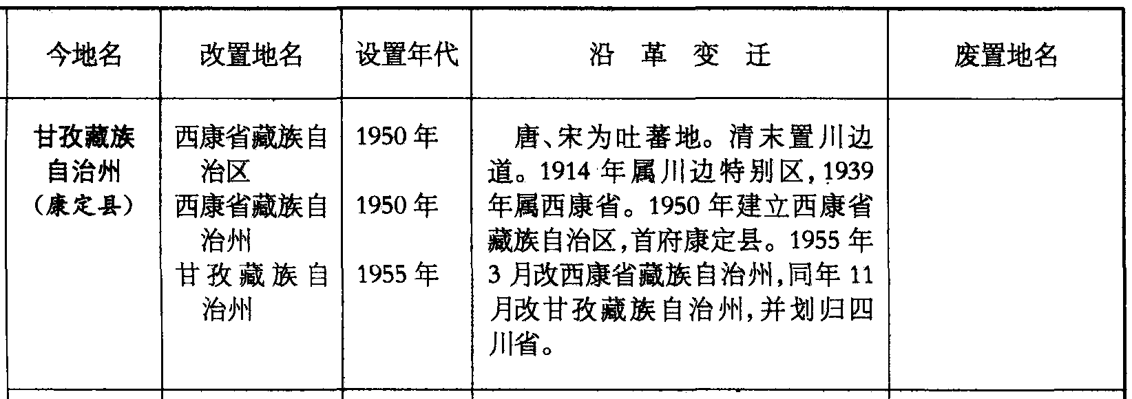 甘孜藏族自治州(康定县)西康省藏族自治区西康省藏族自治州甘孜藏族自治州1950年1950年1955年唐、宋为吐蕃地。清末置川边道。1914年属川边特别区,1939年属西康省。1950年建立西康省藏族自治区,首府康定县。1955年3月改西康省藏族自治州,同年11月改甘孜藏族自治州,并划归四川省。