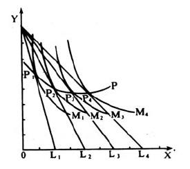 如图,L1、L2、L3、L4分别为在收入、商品Y的价格不变,X商品价格变化情况下产生的预算约束线,M1、M2、M3、M4为无差异曲线,P1、P2、P3、P4为L1M1、L2M2、L3M3、L4M4的切点,则由P1、P2、P3、P4连结而成的曲线P即为价格消费曲线。 这一曲线说明商品价格变动时商品消费量的变化,显示了在收入不变情况下,随著一种商品价格的变动,消费者可消费的两种商品的各种均衡组合。 |
