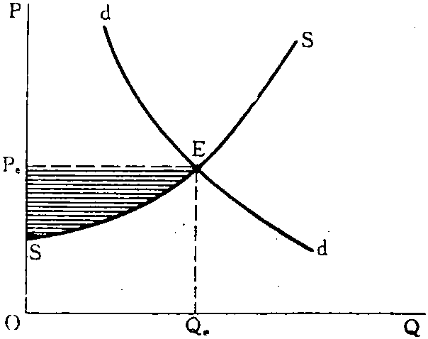 生产者剩余 生产者剩余Producer Surplus也称经济地租,是指生产要素所有者得到的超过他愿意接受的收入部分。按照西方经济学家的观点,经济地租是准地租的一种特殊形式。一般准地租是指边际劳动力较高,素质较好的生产要素,在短期内由需求方面的因素所引起的一种超额收入。而经济地租则相反,是指素质较差的生产要素,在长期内由于需求增加而获得的一种超额收入。它们的共同点都是由需求方面决定,而与供给无关。以劳动这种生产要素对此观点加以说明: 有甲、乙两类劳动生产要素,乙类优于甲类,如果甲类要求每月工资100元,乙类要求每月获得150元,从长期看,因为乙类劳动者已大量增加,社会普遍工资水平已提高到乙类工人所要求的工资水平,因此,他们每月得150元工资乃是正常工资,而不存在超额工资或准地租的问题。但是,由于厂商对劳动需求量的增加,单靠乙类劳动者不能满足需要,还必须雇佣甲类工人。因为工资水平已普遍涨到150元,甲类工人当然也能得到150元,然而,他们本来只要求得100元,其结果却比自己要求的工资多得到50元。这50元就被认为是准地租。但这种准地租不是由生产要素的边际生产力水平提高的结果,而是由于需求数量增加的结果,而且在长期内存在,所以有别于准地租这一概念,取名为经济地租。这种经济地租是生产要素的所有者所得到的超过他愿意接受的收入部分,在一定意义上类似消费者剩余,故也称之为生产者剩余。生产者剩余和消费者剩余的相同点在于:二者都是由实际发生额(实际的收入额或实际的支付额) 与自己心目中所愿意的数额(愿意接受的数额和愿意支付的数额) 之差形成的。因此,都认为是自己所得到的一种 “剩余”。但它们又有明显的区别: 消费者剩余只是一种心理上的感受,并非实际收入的增加; 生产者剩余则是生产要素的供给者得到的一种额外收入,这种收入是实际收入的增加。上述经济地租或生产者剩余是劳动要素的供给者工人实际得到的超过他们本来愿意接受的工资水平的收入,这种经济地租可称为劳动的经济地租。其他生产要素的供给者 (地主、资本家等),当然也可以得到与此相类似的经济地租或生产者剩余。 ☚ 局部均衡论 生产要素 ☛ 生产者剩余 生产者剩余producser′s surplus与消费者剩余相对应的一个概念,具体指生产者按其产品的销售价格实际所得与他的各个较低的供给价格 (按此价格他所愿意销售的数量较少) 之间的差额。通常用价格水平以下和供给曲线以上的面积来测量生产者剩余,如下图的阴影面积所示,其中dd与ss线分别为需求与供给曲线。