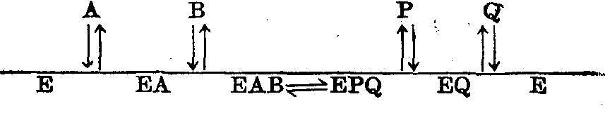 (1)顺序机制: 酶先与底物A生成复合物EA,再与底物B生成复合物EAB。然后顺序形成产物P和Q。