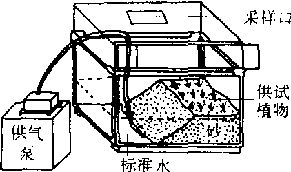 基本结构 早期的生态模拟系统装置比较简单,如供作水生生态系统试验的装置,通常即用大型的玻璃鱼缸或层析缸盛水,按食物链放养多种水生生物;若在其一侧以石英砂堆为陆相,种植作物,放养食叶昆虫,这样就构成了具有陆域和水域的“农田生态系统”;陆生生态系的微型模拟生态装置是由一个可种植植物,又可收集渗漏液的土柱组成(图4)。如要同时研究气体组成成分的变化状况,则要采用密闭式装置并附有气态物吸收系统(图5)。