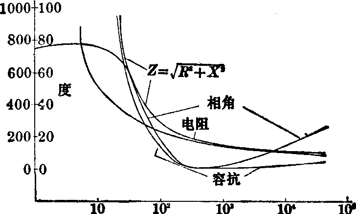 图1 手指部位阻抗与频率的关系[纵坐标: 欧姆(Ω),横坐标: 频率(kc/s)] 阻和电容的组合电路。若通以直流电,则电容提供的阻抗(容抗)无穷大,电流全部从电阻通过。若通以足够高频的交流电,则电流大多通过电容。因此不同频率的交流电穿过细胞的分量不同。用麻醉的狗进行各种在位组织的阻抗和介电常数随频率变化的测定,结果见表2。含有皮肤、肌肉、骨骼、血管、血液等多种组织的复合结构,其阻抗随频率的变化可由手指的阻抗检测结果作代表(图1)。在10kc/s以下电阻、容抗和相角的值都比较高,随频率的增高,三者都迅速减低。100~1000kc/s之间容抗和相角达最小值。1000kc/s以上,容抗和相角又稍有增高。电阻却始终随频率增高而持续下降。只是在100kc/s以下降落较快,100kc/s以上降落较慢。这些结果表2 在位组织的阻抗和介电常数*