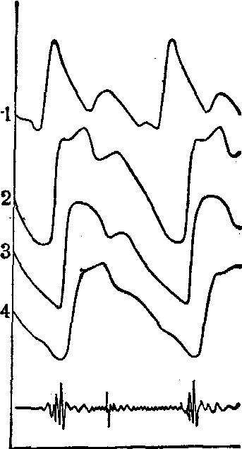 图2正常人脑阻抗随年龄的变异情况(1.青年人,2、3.中年人,4.老年人) 段的容积搏动主要来源于血流的变动。测得的阻抗的变化可以大致推测出器官的血流搏动量或描记出器官的血流搏动图。这两方面在生物学和医学中都得到广泛的应用。例如: 在头部放置一对电极,引导到阻抗仪进行描记,就可以记到脑阻抗图 (图2)。血管弹性的好坏有一定的图形改变。用类似的方法将电极置于肝区皮肤的表面就可以记到肝阻抗图。心脏收缩