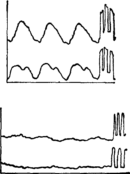 图3 肝阻抗图(上: 正常人,下: 肝硬化和肝癌患者,可见其幅值明显降低) 期向肝内射血引起肝脏体积的轻度扩张,心舒张期血液回流,肝脏回复原体积。根据弹性力学中应力与应变的关系,体积的变化与肝脏弹性之间有一定关系。弹性好,体积变化大;弹性差,体积变化就小。故从肝阻抗图的幅值可以间接判断肝脏的质地。图3列举正常人和肝硬化患者的肝阻抗图改变。最早Nyboer等用阻抗法测量肢体血流量,后推广到测心输出量。方法是在颈部和下胸段各围绕两条电极,外侧一对为馈电电极,输入人体一恒流高频电流。内侧一对为引导电极,将人体该区域的电压变化引入阻抗仪以获得电阻抗波及其微分波。根据Kubicek的半经验公式: 求得心脏每搏输出量(SV)。ρ为血液电阻率,L为引导电极间距离,Z为基础阻抗,dZ/dt为胸阻抗图的一阶微分波的峰值,T为左心室射血时间。用本方法计算的心输出量与其他方法(同位素、染料稀释法)相比较,相关系数在0.58~0.92之间。本方法的优点是能简便地、无损伤地连续监测心输出量,特别适合于用药前后的自身对照的检查。缺点是胸阻抗并非心搏出量这个单一因素的函数。本测量仍作为一个有争议的技术在临床应用,目前在方法上又有一些改进,如提出导纳图法检测等。 人体的组织器官都含有血液,研究血液的阻抗对了解各别组织和器官的电学性质有帮助。血液的电阻抗性质决定于二个主要因素: 血液流动对阻抗的影响; 血球成分对电阻抗的影响。 业已证实,血液流动时比静止时导电性好。流速增快电阻抗降低。有人证实血液移动中的阻抗降低是由红细胞的表面电荷引起的。移动的红细胞产生一个对流电流,使阻抗变小。 为了搞清红细胞成分对阻抗的影响,有人进行模拟实验,驱动血液通过硬质的、容积不易变化的塑料管,用人工泵控制流量使其恒定,用双电极法记录管腔内的阻抗值。任氏液、血浆和血球完全溶解的血液并不引起搏动性电阻抗的改变。只有含有完整血球的液体,才引起容积不变的管腔内的搏动性电阻抗改变。随着红细胞容积百分比的增加,不仅使该液体的总阻抗增大,而且搏动性阻抗值也增大。若红细胞数目不变,用改变渗透压的方法使血球的体积胀大,从而提高液体中血球的容积百分比,搏动性电阻抗的幅值也增大。相反,用凝集剂使红细胞凝集以减少血球的容积,搏动性阻抗值也变小。这些结果提示红细胞成分在阻抗测量中的意义。 在位器官或肢体的电阻抗测量常用的方法有两种: 一种电桥式,将恒压的交流电源引入身体被检测部位,通过同一对电极将阻抗变化引入高频电桥,再经记录装置描记,通常称此为双电极法。另一种是用两对电极,一对输出恒值电流或电压,另一对电极引出被检部位的电位变化,经阻抗仪记录阻抗的波动值或微分,称此为四电极法。这两种方法的基本差异是双电极法易产生极化,使检测结果失真,四电极法可无极化,故结果较准。但四电极法对两组电极之间位置的变异非常敏感,双电极法对电极与皮肤之间的接触阻抗非常敏感。体内电场的分布可以通过电磁场理论引出一定的公式进行计算。例如人体上臂用四电极法检测时,手臂表面的绝对电位的分布可写成: