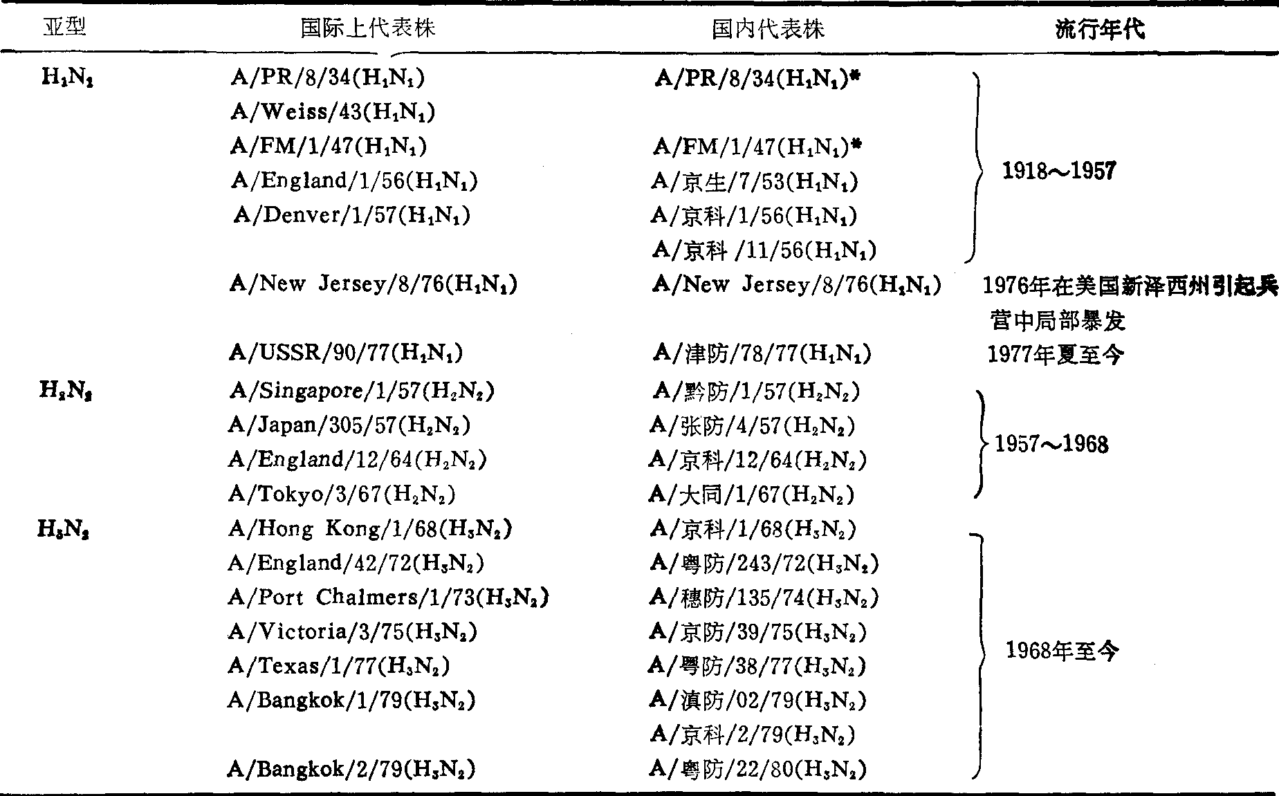 * 为国外引进的病毒株 除了抗原变异外,还有所谓相的变异。相的变异在选择供血清学试验用的病毒株时,有一定的实际意义。甲1(H1N1)型病毒株按血凝抑制试验中所表现的亲和力不同而分为三相: 对本株及异株免疫血清均呈较高效价的为R相;对本株效价高对异株低的为P相;对本株及异株均低的为Q相。甲2(H2N2) 型病毒株可分为Ⅰ相(对非特异性抑制素敏感,对抗体亲和力强)和Ⅱ相(对非特异性抑制素不敏感,对抗体亲和力弱)。但在后期甲2和甲3中敏感性和亲和力常常不是平行的。 甲型流感病毒通常用鸡胚来分离和培养,一般能在鸡胚羊膜腔和尿囊腔中生长。除鸡胚外,常用于病毒分离的有原代人和猴肾细胞,常用于病毒培养的有传代牛和狗肾细胞。但生长和引起病变程度,不同病毒株间有差别。最适生长温度为33~35℃。 人甲型流感病毒可引起人的流感并有时引起肺炎和其他并发症,主要是气管和支气管纤毛柱状上皮细胞的坏死和脱落。有些病毒株能自然感染禽类和哺乳类动物。 流行病学上的最显著的特点是:突然暴发,迅速蔓延,广泛流行。流行形式有散发,局部暴发,流行和大流行。在非流行期间一般发病率较低,呈散发状态。大流行,有时甚至世界性大流行,是由于新亚型的出现,人群普遍地缺乏免疫力,因而传播迅速,流行波及全世界,发病率高。大流行时,在一个机关团体内一次的发病率可高达全体人员的80~90%,个别单位甚至可以达到100%; 在一个较大的人群中常常可有20~50%的人发病。世界性大流行时常有2~3个波,一般讲,第一波持续时间短,发病率高;第二波则拖的时间长,发病率低;有时还有第三波流行。一般情况下,第一波主要发生在城市和交通方便的地方,第二波主要发生在农村交通不便的地方。过去认为甲型流感病毒每2~3年就引起一次流行,每10年左右引起一次世界性大流行。但现在认为甲型流感病毒所引起的流行并没有严格的周期性。有较好记载的,曾发生过世界性大流行的有:1889年,1918年,1957年和1968年(表2)。流感流行常常伴有一般死亡率和呼吸道病死率的升高。 表2 1889年以来世界大流行和近年来出现的猪型和甲1型流行