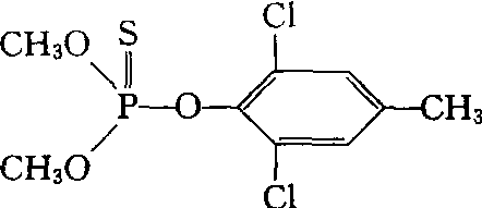 | 释义 | 甲基立枯磷tolclafosmethyl又称利克菌(rizolex)。有机磷杀菌剂。化学名称:O-(2,6-二氯-4-甲基苯基)O,O-二甲基硫代磷酸酯。化学结构式如下。原药为白色结晶,熔点78~80℃,几不溶于水,25℃时在丙酮中溶解度为50.2%,二甲苯中36.0%,环己烷中36.0%,甲醇5.9%,不易燃,不易爆。40~60℃可贮存10个月。对丝核菌和齐整小核菌属真菌引起的多种作物的立枯病和白绢病有效,土壤处理或种子处理,持效期较长。对人畜低毒。大鼠急性口服LD50为5 000 mg/kg,大鼠经皮LD50>5 000 mg/kg。对眼、皮肤无刺激,试验剂量下,未发现致畸、致突变、致肿瘤作用。