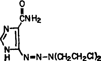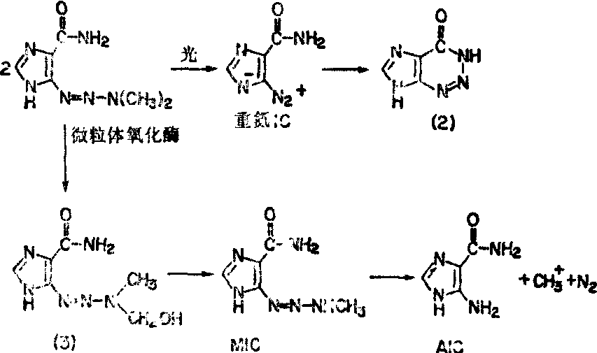 甲氮咪胺 (dacarbazine) 又名氮烯咪胺、deticene、DTIC、DIC。是治疗恶性黑色素瘤的主要药物之一。为白色结晶,m.p. 250~255℃(分解)。在室温1mg溶于1ml水。对光高度敏感,中性溶液在避光下稳定。静脉制剂含有无水枸橼酸和甘露醇,亦可用甲氮咪胺枸橼酸盐或酒石酸盐。 从寻找5-氨基-4-氨甲酰咪唑(AIC)类似物,以抑制核酸合成的设想出发,发现重氮咪唑氨甲酰对实验动物肿瘤有抑制作用。甲氮咪胺作为后者的潜药合成于1959年,它对多种实验动物肿瘤有活性,对艾氏瘤实体型的活性在等克分子剂量下,与丝裂霉素、环磷酰胺和巯基嘌呤的活性相近。在体外和体内甲氮咪胺对RNA和蛋白质合成的抑制强于对DNA的作用。地鼠的卵巢细胞或人的恶性黑色素瘤细胞以N-甲基14C标记的甲氮咪胺处理,只在避光下才能与DNA结合产生标记的DNA。用环上2位14C的甲氮咪胺则不论避光与否,都能找到标记的DNA和RNA。在人、狗或小鼠,其主要代谢物为AIC。此外,从服用甲氮咪胺的患者和大鼠的尿中能分离得7-甲鸟嘌呤。 本品遇光很快分解为二甲胺和高细胞毒的重氮IC,后者环化为低活性的氮杂6-羟嘌呤(2)。在无光下,甲氮咪胺经微粒体氧化酶氧化为羟基化合物(3),然后产生单甲基衍生物(MIC),再分解为AIC和具有烃化作用的阳碳离子CH+3,后者烃化核酸碱基而产生7-甲鸟嘌呤。甲氮咪胺的羟基化合物不稳定,无法比较它和原药的活性。在对二甲三嗪苯甲酸乙酯(p-C2H5OOC-C6H4-N=N-N (CH3)2)系列中,N-羟甲基化合物的活性高于二甲基和单甲基活性。