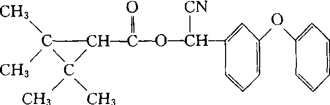 性能 纯品为白色结晶,熔点49~50℃,原药为棕黄色固体,有效成分含量90%以上,熔点45~50℃,20℃时蒸气压为7.3×10-4帕,密度d254 1.150。对光、热稳定,酸性介质中较稳定,碱性介质中易分解,常温下密闭贮存较稳定。难溶于水,易溶于甲醇、环己酮、卤代烃、脂肪烃、芳香烃等有机溶剂。对高等动物毒性中等,原药对大鼠急性经口LD50为70.6毫克/千克(雄)、66.7毫克/千克(雌),对兔急性经口LD50为675毫克/千克(雄)、510毫克/千克(雌),对大鼠急性经皮LD50为1000毫克/千克(雄)、870毫克/千克(雌),对兔急性经皮LD50为2000毫克/千克,对大鼠急性吸入LC50大于96毫克/米3。在试验剂量内对试验动物未发现致畸、致突变和致癌作用。对鱼类等水生生物、蜜蜂、家蚕高毒,对鸟类低毒。杀虫活性高,属神经毒剂,具有触杀和胃毒作用,有一定的驱避作用,无内吸传导和熏蒸作用。残效期较长,对防治对象有过敏刺激作用,驱避其取食和产卵,低温下也能发挥较好的防治效果。杀虫谱广,对鳞翅目、同翅目、半翅目、双翅目、鞘翅目等多种害虫有效,对多种害螨的成螨、若螨和螨卵有一定的防治效果,可用于虫、螨兼治。 应用 加工成乳油、可湿性粉剂等剂型使用。主要用于棉花、蔬菜、果树、茶树、花卉等作物,防治各种蚜虫、棉铃虫、棉红铃虫、菜青虫、甘蓝夜蛾、桃小食心虫、柑桔潜叶蛾、茶尺蠖、茶毛虫、茶小绿叶蝉、花卉介壳虫、毒蛾等。可兼治多种害螨,因易产生抗药性,不作为专用杀螨剂使用。施药时喷雾要均匀,对钻蛀性害虫应在幼虫蛀入作物前施药。残效期一般在10天左右。 甲氰菊酯fenpropathrin又称灭扫利、meothrin。一种杀螨杀虫剂。化学名称:α-氰基-3-苯氧基苄基-2,2,3,3-四甲基环丙烷羧酸酯。化学结构式如下。原药棕黄色液体,密度1.15(25℃)、熔点45~50℃,25℃时蒸气压1 298.56×10-6 Pa。不溶于水,溶于二甲苯、环己烷等溶剂。中等毒性,大鼠口服LD50为70.6~164 mg/kg,兔经皮LD50为2 000 mg/kg。对鱼高毒。可防治棉叶螨、山楂叶螨、柑橘叶螨、温室粉虱、二点叶螨、桃蚜、桃小食心虫、橘蚜等。