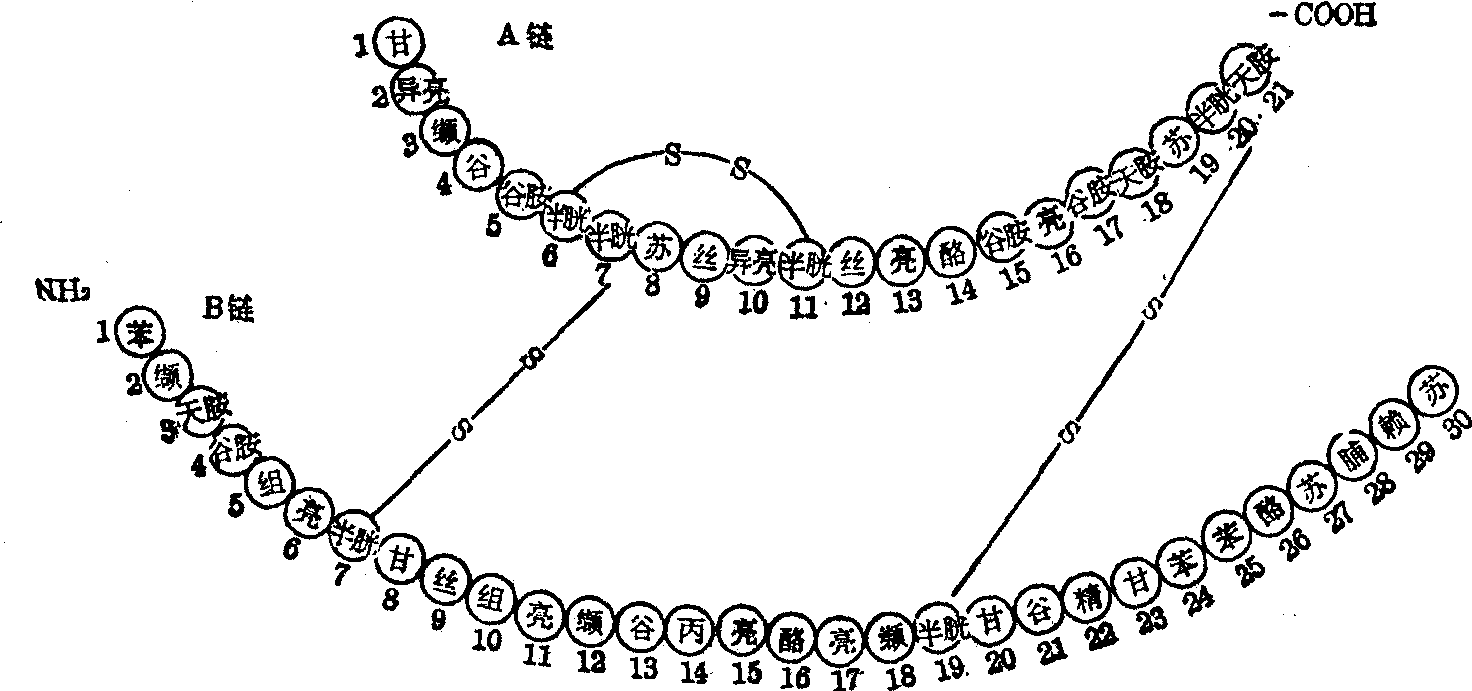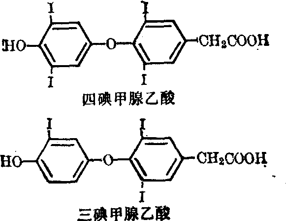 图1 人胰岛素结构 诱导酶蛋白及膜激素受体蛋白的合成 细胞核内有甲状腺激素的受体,虽还未分离出,但已知分子量约为50500,受体结合T3的力量比结合T4大10~40倍。核受体决定线粒体中氧化磷酸化所产生的能量的使用,现知所产生的能量是用于促进蛋白质的合成,一是诱导合成一些酶,例如细胞膜上的ATPase,脂肪细胞的脂蛋白脂肪酶以及心肌细胞的腺苷酸环化酶等; 二是诱导合成细胞膜激素的受体,例如已知甲状腺激素使心肌中β-肾上腺素能受体数目增加,还有脂肪细胞膜上的胰高糖素受体也增加,α-肾上腺素能受体则减少。 ☚ 激素作用机理 胰岛素 ☛ 甲状腺激素 甲状腺激素甲状腺分泌的激素主要有L-3,5,3′,5′四碘甲腺原氨酸(即甲状腺素、T4),L-3,5,3′三碘甲腺原氨酸(即T3)和少量L-3,3′,5′三碘甲腺原氨酸,称为逆三碘甲腺原氨酸(reverse T3,r-T3)。此外,尚释放小量甲状腺球蛋白(TGB)入淋巴液。T3的生物活性比T4约大五倍。正常人甲状腺每日分泌的T4比T3多几倍,但T4约有40%在外周组织脱碘生成T3及r-T3,这是血液中T3和r-T3的主要来源。然而T4并不只是激素前质,如不少甲状腺功能低下的病人,血清游离T3的浓度基本正常而游离T4的浓度低下。晚期胎儿和新生婴儿血液中,游离T4浓度高而T3极少,这些都说明T4本身也有重要的激素功能。正常人甲状腺中也有r-T3,但很少。r-T3不具有一般甲状腺激素的生物活性,但可能抑制T4的生热效应。晚期胎儿和新生婴儿血液中r-T3浓度远比成年人高而T3却难于测到。看来,r-T3也是甲状腺激素的正常成分。甲状腺球蛋白是在甲状腺细胞内合成的一种糖蛋白,分子量约为660,000。每分子甲状腺球蛋白约含140个酪氨酸残基,约有1/3可以碘化成单碘酪氨酸和双碘酪氨酸,其中只有一部分可缩合成为甲状腺激素。