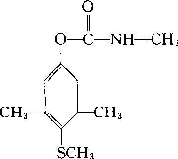 甲硫威methiocarb又称灭虫威,mercaptodimethur,metmercapturon。一种杀虫杀螨剂。化学名称:3,5-二甲基-4-甲硫基酚基甲基氨基甲酸酯。结构式如下。原药白色粉状结晶,略有气味。溶点119℃,25℃时蒸气压4.2×10-7Pa。不溶于水、不溶于己烷,溶于丙醇及甲苯。大鼠口服LD50 (试验前饥饿)10~35mg/kg、(试验前喂食的)为100~130 mg/kg。大鼠吸入LC50 >20 mg/m3空 气。兔经皮 >5 000 mg/kg。可用于棉花、果树、粮食作物、蔬菜防治蚜、螨蓟马、木虱、叶蝉、蟓䖬。还可以防治蛞蝓、蜗牛。主要是胃毒及触杀作用,无内吸作用。对鸟类有很强忌避作用。