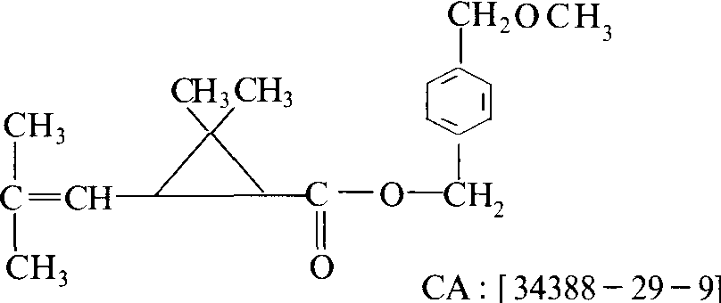 性能 纯品为无色油状液体,原药为淡黄色至红棕色透明油状液体,沸点350℃、150~151 ℃/1.33×102帕、142~144℃ /2. 67 帕,密度 d约 0. 9。对光不稳定,紫外线和热能促使其分解,酸性介质中较稳定,碱性介质中易分解,常温下密闭贮存较稳定。几乎不溶于水,溶于煤油,易溶于醇、丙酮、苯、甲苯等有机溶剂。对高等动物低毒,原药对大鼠急性经口 LD50为4040毫克/千克,对豚鼠皮肤无刺激作用,对眼睛有一定的刺激作用。试验表明在动物体内无明显的蓄积毒性。在试验剂量内对试验动物未发现致突变作用。暂定对人体每日允许摄入量(TADI)不超过0.54毫克/千克,推荐的安全浓度为9毫克/米3。对鱼类等水生生物高毒。与其他拟除虫菊酯比,杀虫活性尚不够高,但化学结构较简单,易合成,属神经毒剂,具有触杀作用、一定的熏蒸作用和快速击倒作用。对多种卫生害虫有效。 应用 加工成乳油、蚊香、电热蚊香等剂型,用于防治蚊、蝇等卫生害虫。甲醚菊酯与氯菊酯或与仲丁威再加上增效剂配成混合制剂,用于防治蚊、蝇、蜚蠊等,可提高杀虫效果。 甲醚菊酯methothrin又称甲苄菊酯、对甲氧甲基菊酯。化学名称:4-甲氧甲基苄基(R、S)顺、反-2,2-二甲基-3-(2-甲基-1-丙烯基)环丙烷羧酸酯。化学结构式如下。是四种异构体的混合物。纯品为无色油状液体,沸点142~144℃/2.67 Pa,折光指数(n20d )1.5132,密度0.9。不溶于水,易溶于各种有机溶剂。适用于室内防治蚊、蝇。大鼠急性口服LD50为4 040 mg/kg,小鼠为1 747 mg/kg。