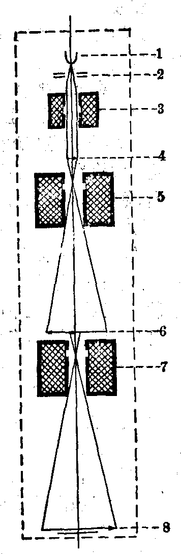 图2 电子束在磁场中的运动轨迹 中心轴的其他一点上,这对电子束说来,磁场起着透镜的作用,称“磁透镜”。电子束在电场影响下亦可成象,但缺点较多,目前多数电镜均不采用。 电镜的磁透镜在线圈外包有软铁的屏蔽外壳,线圈的内侧多数装有高精度加工的铁钴合金极靴。在极靴间隙局部形成具有轴对称的强磁场,这种磁场范围比焦距小的轴对称磁场称为短磁透镜。短磁透镜的焦距与电子加速电压成正比,与透镜磁场强度的平方成反比,透镜磁场强度愈强,焦距愈短,放大倍数愈大。短磁透镜磁场强度与透镜激磁线圈的安匝数(电流与圈数的乘积)成正比,线圈匝数一般是固定的,因此透镜激磁电流愈大,焦距愈短,透镜放大倍率愈大。 电子束通过磁透镜时,速度并不改变,电子束离开原来轨迹形成的折射乃由于外力所致。一个轴对称磁场对电子束的作用相当于一个会聚透镜,但没有明显的界面。 电镜和光镜在光路设计方面有类似处,但电镜采用电子束作为光源。电镜设计必须考虑电子束具有以下特点: ❶电子是带负电的超微粒子,穿透力很弱,唯有在高真空条件下才可能达到一定的自由行程,故电镜镜筒必须保持极高真空,同时,样品必须很薄,一般在100kV加速电压时,样品厚度不应超过0.1μm。 ❷电子束可受电场或磁场影响而改变其行进方向,即使之折射而聚焦,其折射介质为电场或磁场,因而透镜必须是磁透镜或静电透镜。 ❸电子束不引起人眼视觉反应,但可激发荧光物质产生荧光,故电镜观察部分须设置在荧光屏上。 任何显微镜均有四种基本物理过程参与成像,即吸收、干涉、衍射和散射。而在电镜成像过程中,主要是以非弹性散射的反差为主,近年来有人试图以相干光源产生相位反差,来提高电镜分辨本领,但尚属实验阶段。显微镜的分辨率即指其能分辨最近两个质点间的最短极限距离。根据Abbe公式: