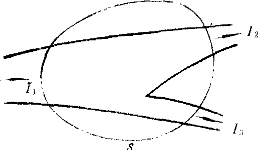 对图2所示的有分支电路,作一个包围分支点的闭合曲面s(如图中双点划线所示),对s面使用稳恒条件下的连续性方程,则得出-I1+I2+I3=0,即I1=I2+I3。上式虽是从具体例子中得出的,不难看出它可以推广。可见,对有分支电路,在稳恒条件下,从某分支点流出的电流等于流入的电流。