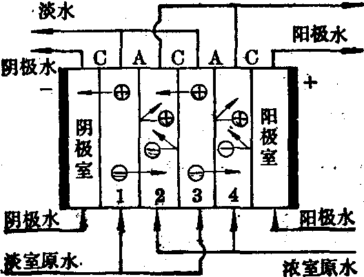 离子交换膜是用具有离子交换性能的高分子材料制成的薄膜。离子交换膜由基膜和活性基团构成。基膜材料常用聚乙烯、聚丙烯、聚苯乙烯或聚氯乙烯等高分子化合物。活性基团是由具有交换作用的阴(阳)离子和与基膜连接的阳 (阴) 离子所组成。含酸性活性基团如磺酸基(-SO3H)、膦酸基(-PO3H2)、羧酸基(-COOH)及酚基( )等的离子交换膜,称为阳离子选择性透过膜,它们能选择阳离子使之透过而不让阴离子透过。含碱性活性基团如季铵碱基[-N(CH3)3OH]、伯胺碱基(—NH2)、仲胺碱基(—NHR)、叔胺碱基(—NR2)等的离子交换膜,称为阴离子选择性透过膜,它们能选择阴离子使之透过而不让阳离子透过。离子交换膜是电渗析器的关键部分,膜性能的好坏将直接影响电渗析器的脱盐效果、电能消耗及使用寿命等技术经济指标。实用的离子交换膜应具备: ❶良好的选择透过性:膜的交换容量(以每克干膜所含交换基团的毫克当量数来表示,mEq/g干膜)和交联度(指构成膜的高分子化合物中所含交联剂的百分率)愈大,则选择透过性愈好。实用离子交换膜的选择透过度要大于90%,既使在高浓度电解质溶液中仍有良好的选择透过性; ❷较小的膜电阻: 膜的导电性将直接影响电渗析器的操作电压和电能消耗,而一台电渗析器往往有数百对膜组成,因此降低膜电阻对提高电渗析运行的经济效益有显著作用; ❸较好的化学稳定性:膜的耐化学腐蚀性、耐氧化性和耐高温性是直接影响膜的使用范围和期限的一个重要因素,一般要求膜在使用环境中至少连续运行一年以上,且其性能很少变化; ❹较高的机械强度:实用膜表面应平整光滑、无孔洞、无裂缝,能适应工作过程中压力的变化而不破裂; ❺较好的尺寸稳定性:膜在溶液中的膨胀性应尽可能小且均匀,并在使用中不因溶液浓度、温度的变化而变形; ❻较低的扩散性能:选用含水率较低、交联度较高的膜,其防扩散性能较好; ❼价格便宜,使用寿命长。隔板是组成膜堆的另一重要部件。它作为膜堆的支撑体,起分隔阴、阳膜的作用,使之保持一定的距离,同时构成浓、淡隔室。此外,作为水流通道,应使两层膜间的水流均匀分布,起到湍流搅拌作用以减少膜表面的滞流层,促进离子扩散,从而提高脱盐效率和降低电能消耗。 电极质量的好坏会直接影响电渗析器的效果和运转周期长短,因此要求材质导电性能好、机械强度高、化学和电化学稳定性强、能耐电极反应产物对其的强烈腐蚀,以及价格低廉、加工方便。 过滤器是电渗析器长期稳定安全运行的主要预处理辅助设备。常用过滤器有砂滤器、废树脂过滤器、活性炭吸附过滤器、微孔管过滤器及超细纤维过滤器等。为防止原水中悬浮物堵塞电渗析器的水流通道和胶体附着在膜上,进入电渗析器的原水必须满足: ❶浑浊度<1.0~3.0mg/L; ❷COD<2.0mg/L; ❸细菌总数≯100个/ml; ❹Fe<0.3mg/L、Mn<0.1mg/L。原水预处理的效果对电渗析器的效率、运转周期和出水水质有很大影响,因此可根据原水水质、处理量及电渗析器的结构组装形式等选择合理的过滤方法及设备。 电渗析器的技术性能及其应用 电渗析器的主要技术性能包括: ❶产水量: 单台电渗析器的淡水产量,m3/h; ❷脱盐率: 经电渗析处理后除去的盐量占原水含盐量的百分比; ❸电流效率: 通入电渗析器的电流在除盐过程中的有效利用率,即从原水中除去等量盐类物质时所需理论耗电量与实际耗电量之比; ❹耗电量:电渗析脱盐时本体直流电耗及动力电耗之和,kWh/m 淡水。影响电渗析器性能的因素是多方面的,其中有原水的物理化学性质;隔板的水力学特性;离子交换膜的选择透过性、膜电位、含水率等膜的物理化学性能; 膜堆组件及电极区组件的材料、形状和几何尺寸等; 预处理的程度、效果以及直流电源的形式等。电渗析运行中的极化和沉淀是电渗析效率下降的重要原因。 五十年代初,电渗析跨入工业应用阶段。随着膜技术的开发和组件性能的不断提高,电渗析技术日趋成熟,显示出下列优点: ❶脱盐范围从每升数十毫克降至每升数百毫克,电渗析法在各种脱盐手段中是最经济合理的,尤其在水资源污染严重,淡水日益匮乏的状况下,电渗析可用于开发生活污水和工业废水作为二次资源; ❷水的回收率可达70~90%,与反渗透法相比,原水利用率较高; ❸电渗析法没有离子交换法的树脂再生问题,可节约大量酸、碱,没有反渗透法的高压噪声问题,也没有蒸馏法的排水、排热问题; ❹与反渗透法相比。电渗析操作方便、方法稳妥,有利于自动化,且设备紧凑、占地小。 电渗析法也存在一些缺点,如: ❶对离解度小的盐类,脱盐效果很差,对非电解质的有机物更是无能为力; ❷当原水含盐量低于200~300mg/L时,膜及溶液的电阻率增加,极限电流密度降低,导致淡水产量降低,单位脱盐量的电耗增加; ❸当原水含盐量过高时,极室很容易产生沉淀,淡水室的膜表面也易极化,影响脱盐效率,增加运转成本,故其脱盐范围小于反渗透法; ❹电渗析的极化沉淀不仅使电流效率下降,电耗增加,而且影响膜的使用寿命、出水水质和电渗析器的正常安全运行; ❺由于离子交换膜尤其是阴膜,具有较高的敏感性,易受悬浮物、微生物、有机物和重金属离子的污染而发生“中毒”,使膜电阻增加,水流不畅,从而影响电渗析器的正常运转。 电渗析可用于海水淡化,工业用水处理、城市污水三级处理,以及电镀、造