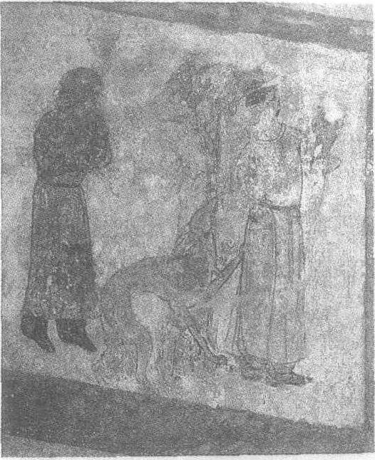 唐神龙二年(公元706年)。纵169厘米,横133厘米。陕西省乾县乾陵陪葬墓懿德太子墓第二过洞西壁小龛北侧壁画。1971年发掘。树下一男侍戴幞头,着圆领长袍,系腰带,左手驾鹞,侧身回首。一条细长的黄犬翘起一前腿搭于侍者身体之上,尾巴向上内卷,样子十分亲切。黄犬身后另有一拱手而立的男侍。此画构图严密,绘画线条婉转,具有很强的写实性,一只家犬的参与增添了几分情趣。