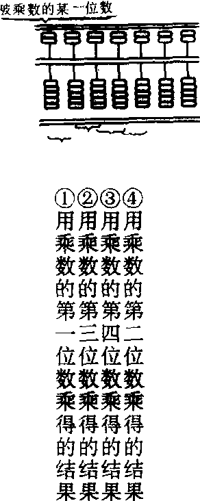 多位数相乘时,先用乘数的左起第二位上的数去乘被乘数的末位数, 再用乘数的左起第三位、第四位数……去乘被乘数的末位数,最后用乘数的最高位上的数去乘被乘数的末位数, 然后对被乘数的右起第二位、第三位……上的数依次按这一顺序进行运算。运算时,如果出现被乘数的某一位还没有同乘数的最高位数相乘, 而在被乘数的右一档上的乘积已满10或超过10时,暂不进位,要利用底珠或顶珠加以解决,直到乘数的最高位乘过之后,再把得数中的底珠或顶珠加以调整。这种算法因是从乘数的中间数字(第二位)起算,所以也叫做穿心乘。由于中国大部分地区做乘法时习惯使用“小九九”, 用乘数去乘被乘数的某一位数时, 把这位数保留到与乘数的每一位数乘完才“破掉”它,这样就可以减少错误,而且拨珠次数较少,运算速度较快, 还可以和除法中的归除互相还原, 因此自明代以来就是珠算乘法中流传最广的一种。其缺点是有时要用到底珠、顶珠,只能用七珠的大算盘,也比较难学。