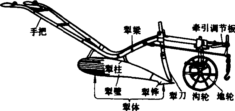 畜力犁animal plough用牲畜牵引的铧式犁。 中国古代用畜力耕地起源很早,但其确切时间,历史文献上说法不一。《山海经》载:“后稷播百谷,稷之孙始作牛耕”,这是牛耕始于三代说。清赵春沂《牛耕说》则认为“牛耕当始自神农氏(公元前3218~前3079年),这是偏早的说法。北魏贾思勰的《齐民要术》说:“赵过始为牛耕,实胜耒耜之利”。赵为汉代农官,这是偏晚的主张。元《王祯农书》则认为“盖牛之耕,起于春秋之间”。20世纪以来,一些学者研究考证又提出中国的牛耕至晚应开始于殷代武丁到帝乙时期(公元前1324~前1155年)。以上诸说,还无定论。世界其他地区的农业古国,如埃及、希腊、印度等,很早以前在驯服兽畜拖拉重物的同时,就创造了用畜力牵引的耕地工具。而以埃及为最早。 在蒸汽机和内燃机没有发明以前,世界各地的犁,除少数人拉犁外,都是畜力犁。中国的畜力犁结构简单、轻便、用一个把手。一般只用1头或2头牲畜牵引,并有长辕、短辕之分。长辕犁辕杆很长,向上翘起。前端置一横木,由两头并排的牲畜牵引,横木架在牲畜的肘肩上,称之为“二牛抬杠”。短辕犁的辕杆弯曲如弓形,亦称曲辕犁,用套绳牵引,使用灵便,是长辕犁的改进。这种犁在秦汉以后逐渐成型。唐陆龟蒙所著《耒耜经》对其描述甚详。中国现代使用的传统犁与唐代的犁基本相同。 欧美的畜力犁多为双把并带有前轮架,犁辕置于前轮架上(图1)。稳定性好,在用多头牲畜牵引时亦能工作平稳。没有轮子的犁,欧洲称为“摇摆犁”,构造简单,但工作稳定性差。