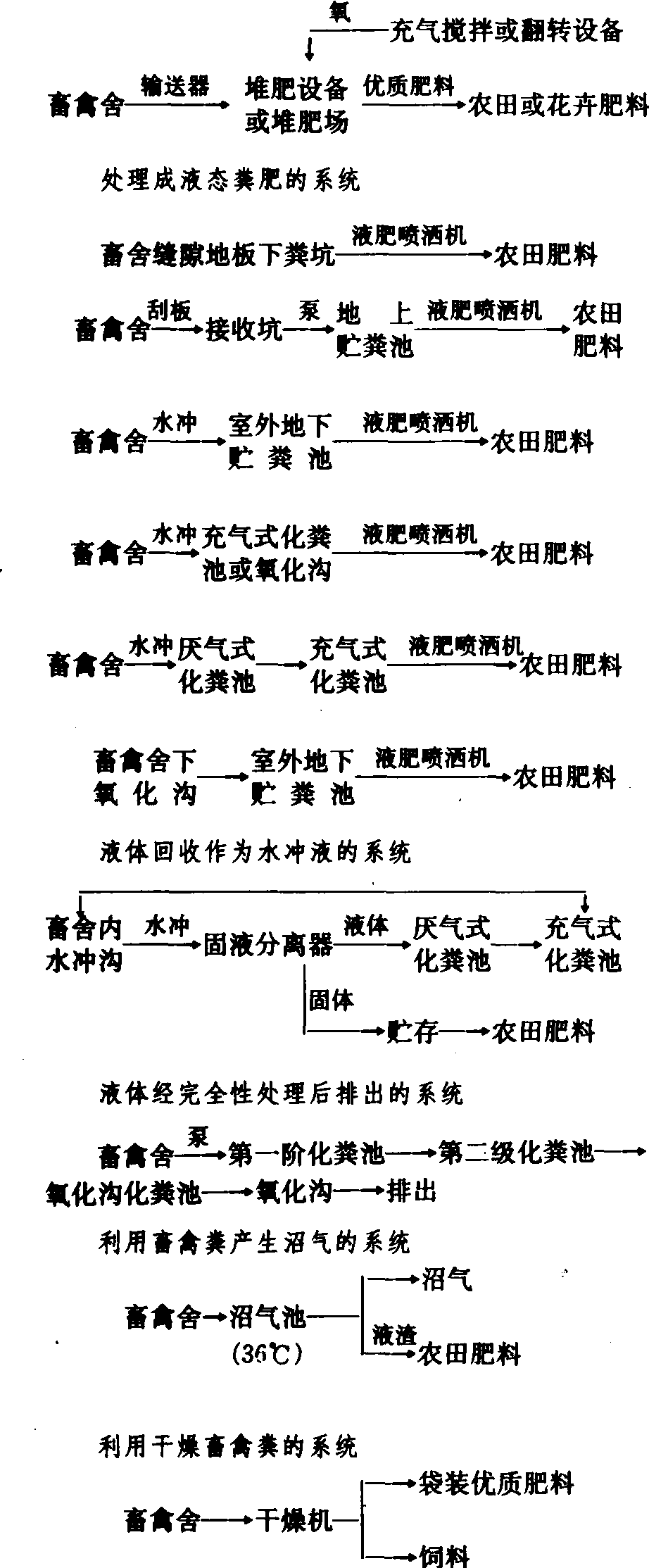 注: 稀释后粪液含氮量为3 000毫克/升 干燥设备 可将畜禽粪便从原有含水率干燥到含水率10~15%。干燥过程中有机物质损失少,能保持大部分蛋白质和其他营养物质,产品可以作为饲料或优质肥料,目前以干燥鸡粪为主。 畜禽粪便干燥设备有:❶气流式干燥机。由燃烧的重油或可燃气将空气加热到550~650℃。破碎成细小部分的粪便, 随热气流流动而逐渐干燥,气流逐渐冷却到100~150℃,并通过旋风分离器将干燥的粪便分开,粪便颗粒内部温度不超过55℃。干燥后粪便颗粒尺寸为2毫米左右。2.5~5万只鸡配用一台。 ❷滚筒式干燥机。粪便由带齿搅龙喂入缓慢回转的滚筒,并被破碎。烧油或可燃气的燃烧器将空气加热,热空气进入滚筒内或滚筒下,作业温度为200~300℃,粪便滞留时间可根据进入粪便的含水率来进行调节,1.5~2.5万只鸡配用一台。 ❸微波干燥机。由一移动带将粪便通过微波作用区,利用微波加热,干燥程度可以调节。由于微波是激发粪便中的水分子振动而引起发热,外界无热量传入,所以干燥很均匀。英国生产有可供40万只鸡鸡粪干燥用的连续式微波干燥机。 ❹太阳能鸡粪干燥设备。塑料大棚利用太阳能提高棚内温度,棚内有水泥地面,上铺15厘米厚的鸡粪,两侧有导轨,导轨上支承可移动的搅拌装置,后者为绕水平轴线回转的带搅拌板的轴,移动的同时搅拌鸡粪,并由搅拌装置上的风机吹风,以加速鸡粪干燥。结构简单,能量消耗低,适用于10 000只鸡场。 机械分离设备 可将畜禽粪便分离成液态部分和固态部分。液态部分可进入贮粪池、化粪池或氧化沟等作进一步处理;固态部分可作为土壤改良物料施入农田,或干燥后作垫草或绝热建筑材料。机械分离经常是在畜禽粪便贮存前或进行生物处理前的一项工序,可减少生物处理设备中的沉淀物,减少其容积和延长其使用期,便于输送,减小堵塞,减轻污染和臭味等。但能量消耗大,投资高,常用于大型企业。机械分离设备主要有:❶固定筛式分离机。是一斜置的筛板,粪便沿筛面下滑时,液态部分通过筛孔落下,固态部分下滑排出。这种分离机不需动力,能分出35%的总固体量,但分离出的固态物较稀(一般干物质含量8%),不能成型。英国生产的一种机型,另加有一液力压缩机进一步压缩分离,形成的固态物干物质含量可达40%。最大机型效率为180米3/小时牛粪浆,液力压缩机功率4千瓦。 ❷振动筛式分离机。利用动力使筛子(平面筛)振动,分出的固态物干物质含量高于固定筛式(达16%),但分离出的固体总量较少。英国一种机型的振动筛直径1.1米,分离干物质含量为1.2%的牛粪液时,液态物排出量2160千克/小时,固态物排出量270千克/小时,固态物可堆积成型,振动筛需动力0.75千瓦。 ❸离心式分离机。利用离心力来进行固液分离,由于固态部分有较大的离心力,从而可将其和液态部分分开。其典型结构为一端带锥形的滚筒,内有螺旋输送器,两者分别传动,滚筒转速近3 000转/分,螺旋输送器的转速稍低于滚筒。当稀粪进入滚筒后,由于离心力作用,比重较大的固体被甩向滚筒圆周,由于螺旋输送器与滚筒的速度差,固态粪被螺旋输向一端,液体部分被输向另一端,两者都由各自的出口排出。离心式分离机能分离出干物质含量较大的固态物。英国生产的一种离心式分离机,重400千克,转子转速3 000转/分,生产率8米3/小时,所需功率5千瓦,分离出的固态物干物质含量达30%。有的离心式分离机固态物干物质可达45%。 ❹压辊式分离机。利用挤压将粪便的固液分离。一般设两套压辊,每一套由表面带孔的滚筒和橡胶辊组成。经过胶辊和滚筒的挤压,液态部分从孔眼漏出,固态物被挤压后进入另一套压辊挤压最后排出。滚筒直径约300毫米,转速80转/分,生产率8米3/小时,功率为1千瓦。这种分离机比较适合于分离牛粪。 处理系统 各种处理设备的组合。随着畜禽种类、饲养方法、饲养场集约化程度、拥有农田面积、饲养人员素质等的不同,处理系统也会有很大的差异,需要进行综合分析考虑,确定出最经济合理的处理系统。常用的处理系统如下: 处理成固态粪肥的系统