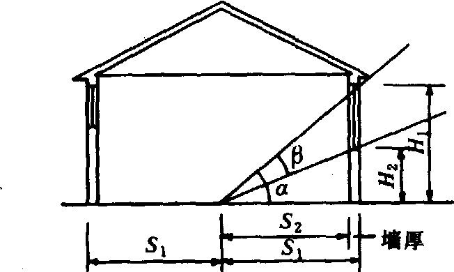 畜舍自然采光natural lighting of livestock house使畜舍内获得直射或散射太阳光的技术措施。开敞式、半开敞式及有窗式的畜舍均为自然采光。自然采光能节省能源,但光照强度、时间、明暗变化和光照均匀程度等均随季节、时间、天气状况的变化而改变,并受地理纬度、畜舍的朝向、间距、跨度及周围遮挡物的影响,难以按家畜要求进行控制。自然采光畜舍一般也应设置人工照明设备,以备自然光照强度和时间不足时用作补充照明。 畜舍自然采光设计,须正确选择畜舍的朝向,合理确定畜舍的间距,并根据家畜和畜牧生产要求,合理设计窗口的形状、大小、数量和位置,以尽可能保证舍内光照强度和照度均匀,防止夏季直射阳光照进畜舍,或满足冬季某些畜舍需阳光直接照射某一定部位的要求。 在确定畜舍朝向时,宜使畜舍纵墙在冬季多接受太阳辐射,在夏季少接受太阳辐射,这样不仅可以改善冬夏季舍内温度状况,而且可以在冬夏两季太阳辐射强度相差悬殊的情况下,减小舍内照度的季节差异。中国处于北半球,各地太阳辐射日总量,冬季均为南向最大,夏季均为东西向最大,因此,畜舍朝向一般以南向(畜舍长轴东西向)或南偏东、西30°以内为宜。 确定畜舍间距时,应在最冷季节保证畜舍南墙有4~6个小时(当地正午前后各2~3个小时)满日照。据计算,中国北纬50°以南的广大地区,畜舍间距为檐高的5倍,即可保证在大寒日有6个小时的南墙满日照,即使在中国最北端的漠河、乌苏里(北纬54°)等地,也可以保证有5个小时的南墙满日照,随着纬度降低,畜舍间距可以缩小,但间距过小,将影响夏季畜舍通风和场区污浊空气的排除,故最小间距应不小于檐高的3倍。 舍内照度的均匀程度,取决于窗口上下缘的位置、窗口的形状及窗间墙的宽度等因素。为保障畜舍跨度(进深)方向照度的均匀,要求窗口的入射角α不得小于25°,透光角(开角)β不得小于5°(见图)。入射角是指舍内地面中央一点(跨度1/2处)与窗口上缘的连线(出檐较长时为与屋檐的连线)和舍内地面的夹角;透光角是指舍内地面中央一点分别与窗口上、下缘连线之间的夹角。根据入射角和透光角设计窗口上、下缘高度(H1和H2),可按畜舍跨度1/2处分别至墙外皮和墙内皮的距离(S1和S2),使H1≥0.47 S1,H2≤0.36 S2,即可保证α≥25°,β≥5°。由于畜舍的高度一般在3米以下,从而限制了窗口上缘的高度,在跨度大于8~9米的畜舍内,难以保障入射角大于25°,其中部照度将无法保证。窗口形状直接影响舍内照度分布,在窗口面积相同的情况下,高度大于宽度的立式窗,能使舍内跨度方向的照度较为均匀,高度小于宽度的卧式窗,能使舍内长轴方向的照度较均匀,方形窗口则介于两者之间。选择何种形状的窗口,应根据畜舍跨度决定。窗间墙的宽度愈大,不仅使舍内照度不均匀,而且会使窝风区加大(特别是温暖季节开窗时),导致通风不均匀。因此,当所需窗口总面积一定时,可用多设窗、设小窗的方法减小窗间墙的宽度。