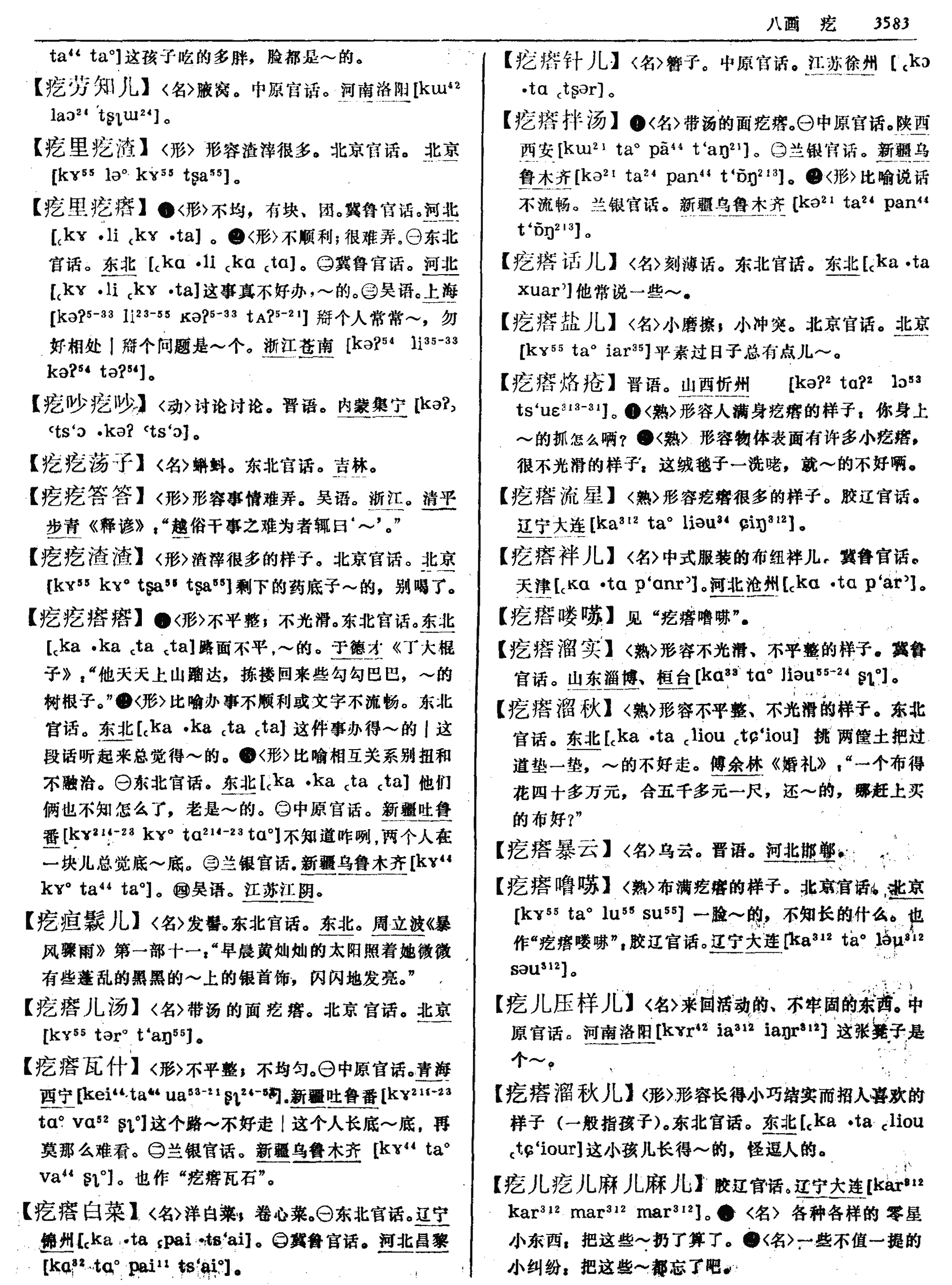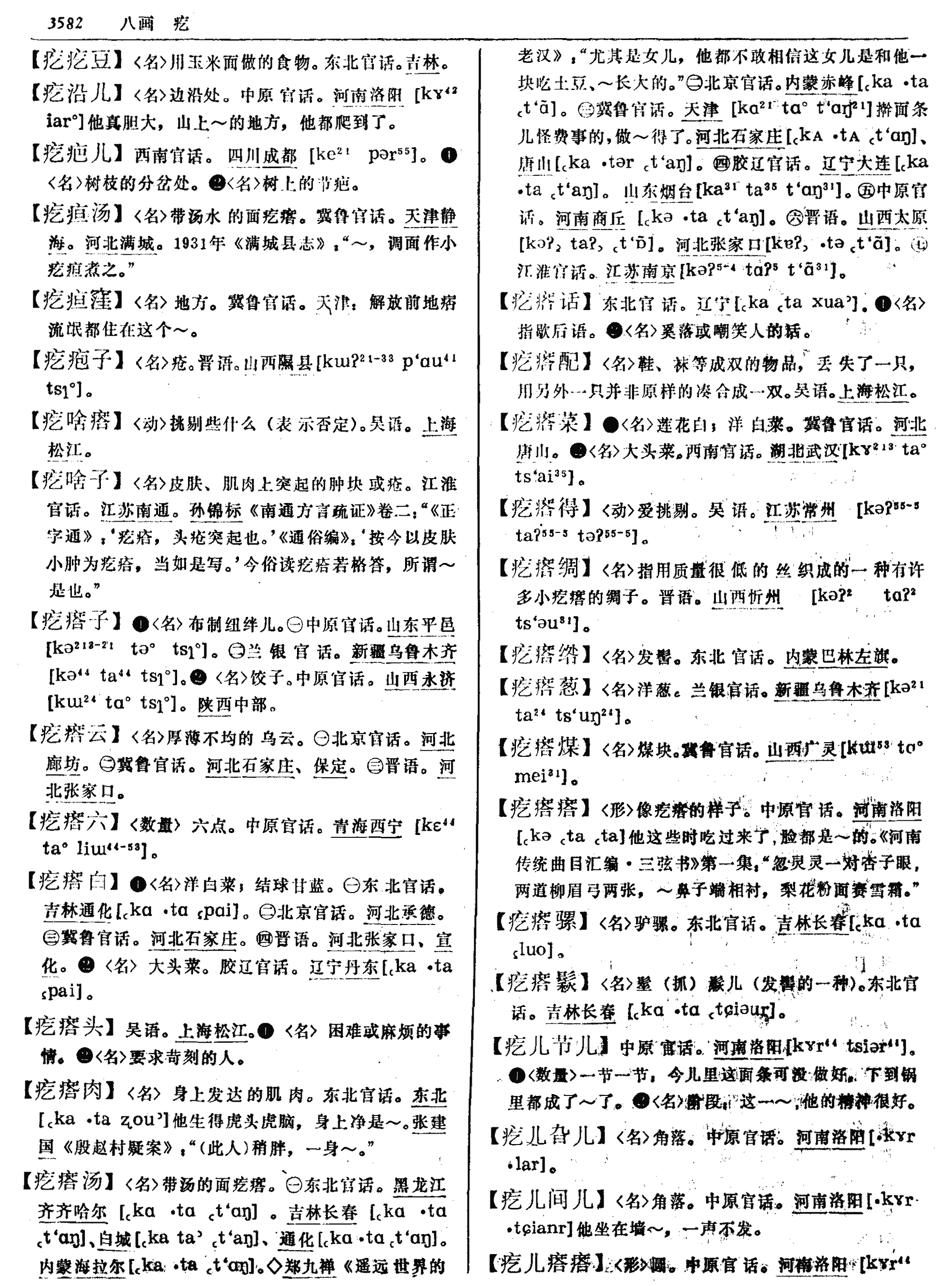 疙瘩汤3582带汤的面疙瘩。东北官话。黑龙江齐齐哈尔〖〗。吉林长春〖 〗、白城〖〗、通化〖〗。内蒙海拉尔〖〗。◇ 郑九禅《遥远世界的老汉》:「尤其是女儿,他都不敢相信这女儿是和他一块吃土豆、~长大的。」北京官话。内蒙赤峰〖 〗。冀鲁官话。天津〖〗。擀面条儿怪费事的,做~得了。河北石家庄〖〗、唐山〖〗。胶辽官话。辽宁大连〖 〗。山东烟台〖〗。中原官话。河南商丘〖〗。晋语。山西太原〖〗。河北张家口〖〗。江淮官话。江苏南京〖〗。