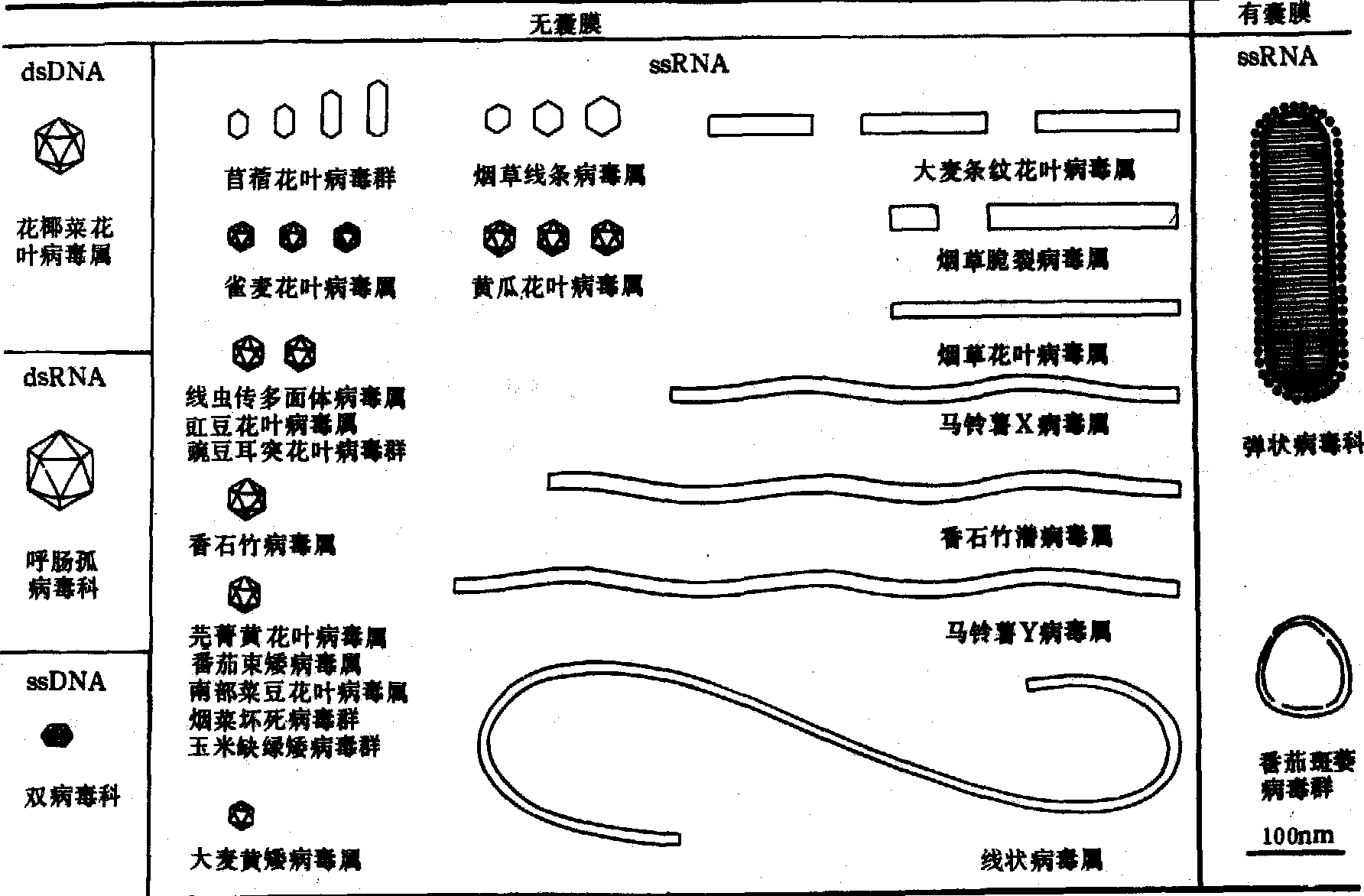 脊椎动物的病毒各科 在感染脊椎动物的病毒中得到病毒分类和命名委员会承认的有19个科,其中DNA病毒有6科,RNA病毒有13科(表1)。科以下设属,有些在科与属之间还设亚科。科、亚科和大部分属均有学名,少数属尚用俗名。近年来有些学者把部分未分类和新发现的病毒设立新科,如嗜肝病毒科和凸隆病毒科等。 节肢动物病毒各科 已知有11个科的病毒能感染节肢动物,主要为昆虫。其中9个科的某些属感染脊椎动物。不少成员既感染吸血节肢动物,又感染脊椎动物。在前者中呈隐性感染,侵入后者时表现临床症状,它们被称作虫媒病毒。只有2个科专门感染节肢动物,即杆状病毒科和野田病毒科,特别前者引起的病最多,危害最严重,如核型多角体病毒。病毒水平传递主要为经口感染,也有通过卵作垂直传递。多种病毒已用于昆虫的生物防治,如用核型多角体病毒防治棉铃虫效果良好。 植物病毒各科群 除了呼肠孤病毒和弹状病毒两科(大部分成员感染脊椎动物和节肢动物)外,专门感染植物的病毒共分23群(表2),在分类上还未建立“科”这一级,属的名称中一部分尚用俗名。在形态上,有11群呈20面体对称,7群呈螺旋状对称的杆状,剩余5群的结构尚未清楚。在这23群中只有1群具有囊膜。极大多数病毒的基因组为正股的线状单股RNA,只有个别群为其他核酸类型。植物病毒是仅次于真菌的重要植病病原,被感染植物表现变色、坏死和畸形等症状。 病毒一类由核酸和蛋白质组成但没有细胞结构的微生物。公元前10世纪中国已发现天花,公元11世纪已有应用痘痂喷鼻法和浆苗接种法以预防天花。1892年俄国植物学家伊万诺夫斯基(Д.И.Ивановский)发现了烟草花叶病毒。1937年英国的鲍登(F.C.Bawden)和皮瑞(N.W.Pirie)确定病毒的化学组成为核蛋白。病毒DNA的分子量范围为1×106~200×106,RNA的分子量范围为2×106~15×106。每种病毒仅含1种核酸。人类和动物的传染性疾病约有60%由病毒引起。 病毒 病毒bingdu一类体积极小、没有细胞结构、主要由蛋白质和一种核酸(DNA或RNA)组成的、在专性活细胞中寄生的微生物。比细菌小得多。直径在20~40纳米之间。大的如痘病毒,大小为200×250-350纳米,与小的细菌相近;小的如口啼疫病毒,直径只有22纳米,与血红蛋白分子相仿。多数病毒须借助于电子显微镜才能看见。寄生于动物细胞的病毒多为球形、卵圆形或砖形;寄生于植物细胞的病毒多呈杆状或丝状;寄生于细菌的病毒多为蝌蚪状。所有病毒都有一个由一科核酸组成的内芯和一个由蛋白质组成的外壳。某些病毒(如痘病毒)在其被膜中尚含有脂类和多糖。病毒无独立的代谢系统,只能依靠特定宿主活细胞的酶系统和原料合成核酸和蛋白质,并组装成新的病毒粒子。离开了特定的宿主活细胞,病毒就不能表现出任何的生命现象。通常根据宿主细胞的不同,将病毒分为动物病毒、植物病毒和微生物病毒(噬菌体)三大类。近年又根据所含核酸的类型(DNA双、单链和RNA双、单链),将病毒分为4类43属、组,其中双链DNA病毒分为11个属、组;单链DNA病毒分为3个属组;双链RNA病毒分为2个属、组;单链RNA病毒分为27个属、组。有的病毒对宿主无致病作用(如呼肠弧病毒); 不少病毒能使人体及动、植物致病(如麻疹、传染性肝炎、鸡瘟、口蹄疫、烟草花叶病、水稻矮缩病等);有些病毒可用于防治害虫和病原菌。1969年以来,还发现了一类体积更小、危害植物的裸露RNA致病因子,称为类病毒(vi-roid),如马铃薯纤块茎病(potato spindlc tuber disease)就是由一种类病毒引起的。关于病毒的起源,有两种假说:一种认为病毒是由细胞的核酸片段经过长期进化、获得了对宿主细胞的一定程度的独立性而成;另一种认为病毒是由较复杂的寄生生物逐渐退化而成,但至今尚未发现介于病毒和细胞寄生物之间的中间体。 ☚ 药物学 动物学 ☛ 病毒Virus系一类体积极小、能通过细菌滤器、普通显微镜下见不到、在电子显微镜下才能观察到、只能在一定的活细胞内生长繁殖的非细胞结构的微生物。病毒形态不一,但以球形为多;大小相差很大,最小的约为7~12nm,大可达450nm,其化学组成都含有核酸和蛋白质。真正的病毒只含有1种核酸,即核糖核酸(RNA)或脱氧核糖核酸(DNA),并以此把病毒分为两大类。病毒结构是以核酸为核心,外面再包绕蛋白质衣壳。构成衣壳的粒子称为亚单位,亚单位呈规律的排列。在球形的病毒中亚单位排列为螺旋状或20面体两种。在较大复杂的病毒中,除上述构造外,在衣壳外面还包以囊膜。目前认为核酸与病毒的传染性、遗传性、变异性有密切关系,如病毒核酸结构改变,病毒便发生变异。病毒一般耐寒不耐热,多数病毒在室温下只活短时间,在零下70℃可活数月。病毒无完整酶系统,不能独立进行代谢,必须依靠宿主细胞进行代谢完成其繁殖。病毒在细胞内生长繁殖,可引起细胞形态发生改变——在细胞内形成包函体。目前发现的致病性病毒达250多种,可通过接触、飞沫、钡食、动物咬伤等方式使人感染疾病。某些化学合成药、某些中药、干扰素等对病毒有抑制或杀灭作用。 病毒 病毒Bing du一类没有细胞结构但具有生命现象的微小生物。个体微小,常以纳米为度量单位(1微米=103纳米),要借助于电子显微镜才能观察到。能通过细菌过滤器,故又称过滤性病毒。其结构完整并具侵染能力的病毒颗粒,称为病毒粒子;内只含单分子的脱氧核糖核