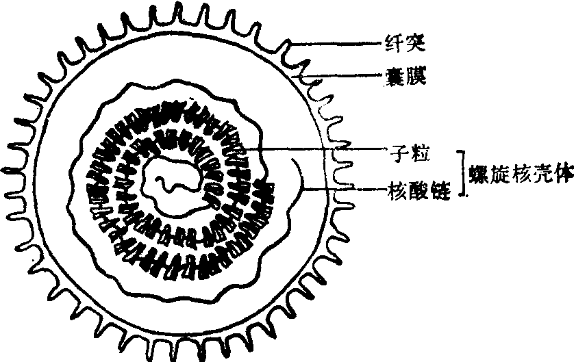图2 螺旋对称型病毒(粘液病毒)剖面示意图 病毒的增殖 病毒在宿主细胞内的增殖(复制)是病毒生命活动与遗传性的具体表现。病毒的增殖过程首先是病毒侵入细胞,病毒核酸“篡夺”细胞DNA对代谢过程的“指导”作用,利用宿主细胞的全套代谢机构,以病毒核酸为模板,进行病毒核酸的复制与转录,并翻译(或称译制)病毒蛋白质,然后装配成新一代的病毒颗粒,最后从细胞中释放出来,再感染别的细胞,开始下一轮的周期。凡结构装配完整的,并且有感染性的病毒才称为病毒颗粒或成熟病毒。病毒的增殖过程如下: 病毒在细胞表面的吸附 由于病毒与细胞之间的相互物理作用(分子布朗运动与静电引力),病毒可以随机地吸附在细胞表面,但这是非特异性的吸附。病毒能不能侵染细胞,首先决定于病毒表面的特异结构与敏感细胞表面膜的互补接受点能否相结合,这是特异性的吸附。这种特异的“识别”能力主要由病毒表面的特异蛋白 (或糖蛋白)与细胞表面外被的糖蛋白成分所决定。本来某种病毒对某种敏感细胞有感染性,若用蛋白酶破坏其互补接受点,病毒就会丧失特异吸附能力,最终失去感染性。相反,有些病毒,当它们是完整的病毒时,由于不能发生特异性吸附而不能使某种细胞感染,但提纯的核酸(无蛋白衣壳)却能感染该种细胞。以上事实均可说明,病毒表面特异结构与细胞表面互补接受点的结合是病毒进入细胞的前提。 病毒进入细胞 根据实验观察,动物病毒进入宿主细胞的主要方式是细胞以“主动”的吞饮作用使病毒进入细胞。当病毒吸附于细胞表面时,细胞以吞饮泡的方式将病毒裹进细胞内。但有些囊膜的病毒,以其囊膜与细胞膜融合的方式而进入细胞。 病毒增殖的黑暗期 病毒进入细胞以后,在细胞的蛋白水解酶的作用下,衣壳很快就裂解,释放出核酸,从这时开始病毒就失去感染性,一直到细胞内形成新的有感染性的病毒颗粒为止,这整个阶段称为黑暗期,象脊髓灰质炎病毒与口蹄疫病毒等小RNA病毒的黑暗期仅约2h,而人腺病毒则约14h,也有更长者。 病毒核酸的复制、转录与蛋白质合成 据目前所知,病毒的核酸类型可分为四组:双链DNA病毒、单链DNA病毒、双链RNA病毒、单链RNA病毒,其中单链RNA病毒又可分为侵染性RNA病毒、非侵染性RNA病毒以及带有逆转录酶的单链RNA病毒(肿瘤病毒)。 各种病毒的核酸复制类型