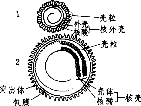 病毒粒体 1.一枚无包膜病毒粒子的切面(螺旋式对称) 2. 一个有包膜病毒粒子的切面 |